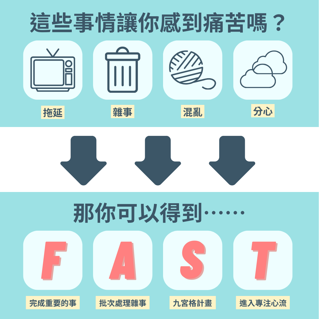 掌握時間管理心法 FAST 法則(要事、行動、切小、番茄),從混亂中找到方向。