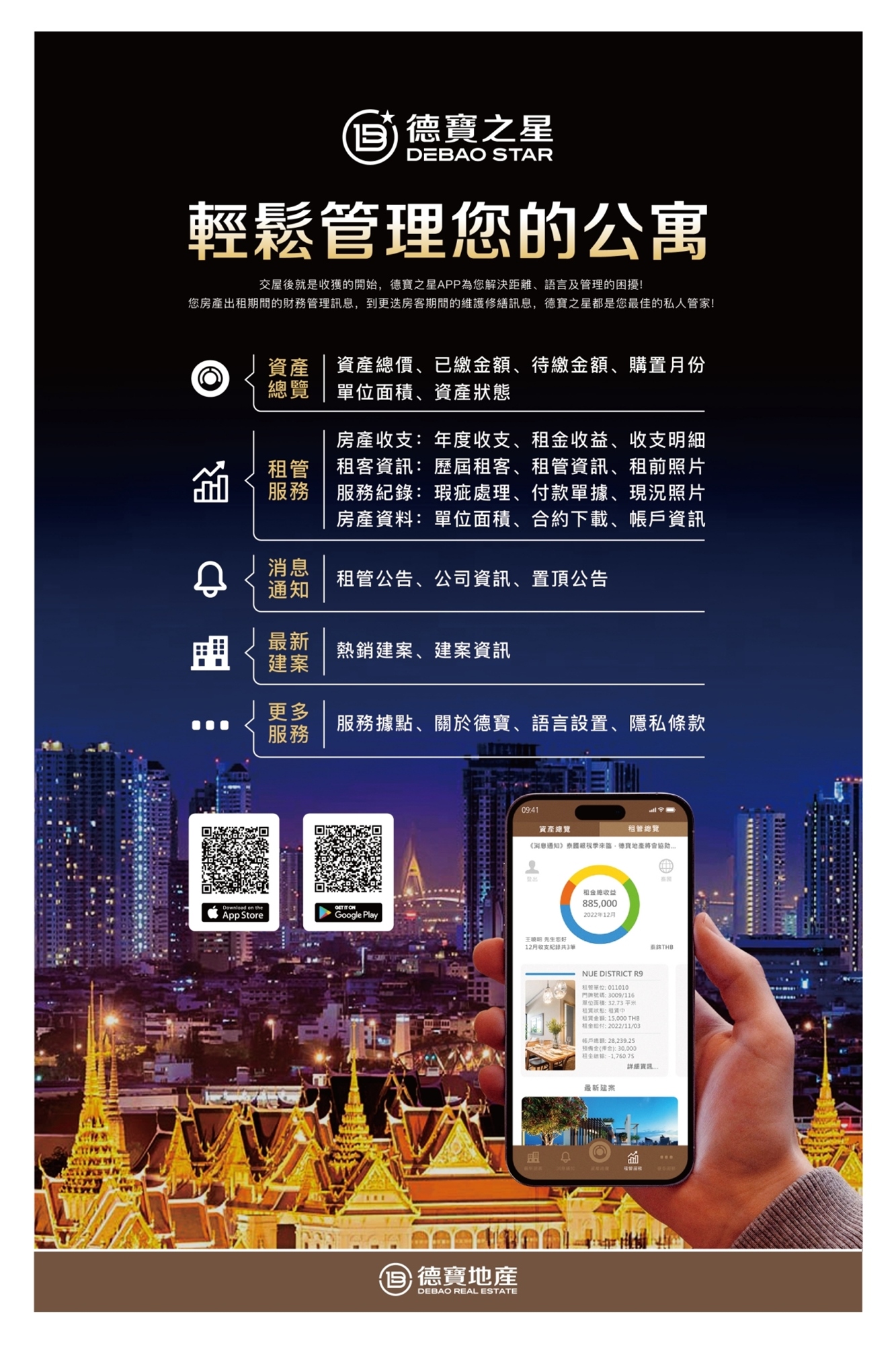 提供給客戶屋主管理APP與多語客服系統,跨國專業團隊為每一位德寶貴賓提供完善的不動產售前售後服務,讓海外買房變成一件令人安心、放心的體驗,可以顯示出我們德寶地產對於客戶的用心,可以關照客戶的海外地產投資後續提供您一站式的服務,泰國直營公司讓中英泰三種語言的租客皆可以是您的租客來源,後續的溝通與服務都由我們的代租管部門接洽,不須擔心買房後對接的問題!
