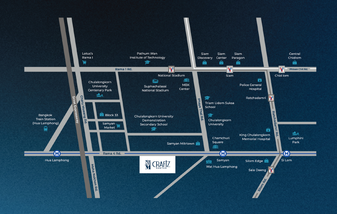 Whizdom Craftz Samyan 位於難得的黃金地段。 靠近許多教育機構 領先醫院 一個孕育新一代的社區 還有配套齊全的百貨公司和旅遊、吃飯、購物的場所,滿足了這個時代人們的所有需求