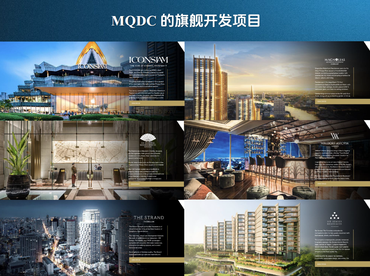 MQDC擅長打造整 合型的開發 案 象徵泰國繁榮發展的巨型綜合型開發計畫,從計畫到完工持續受國際關注的時代地景 ICONSIAM暹羅天地,便是 MQDC的心血之作 。