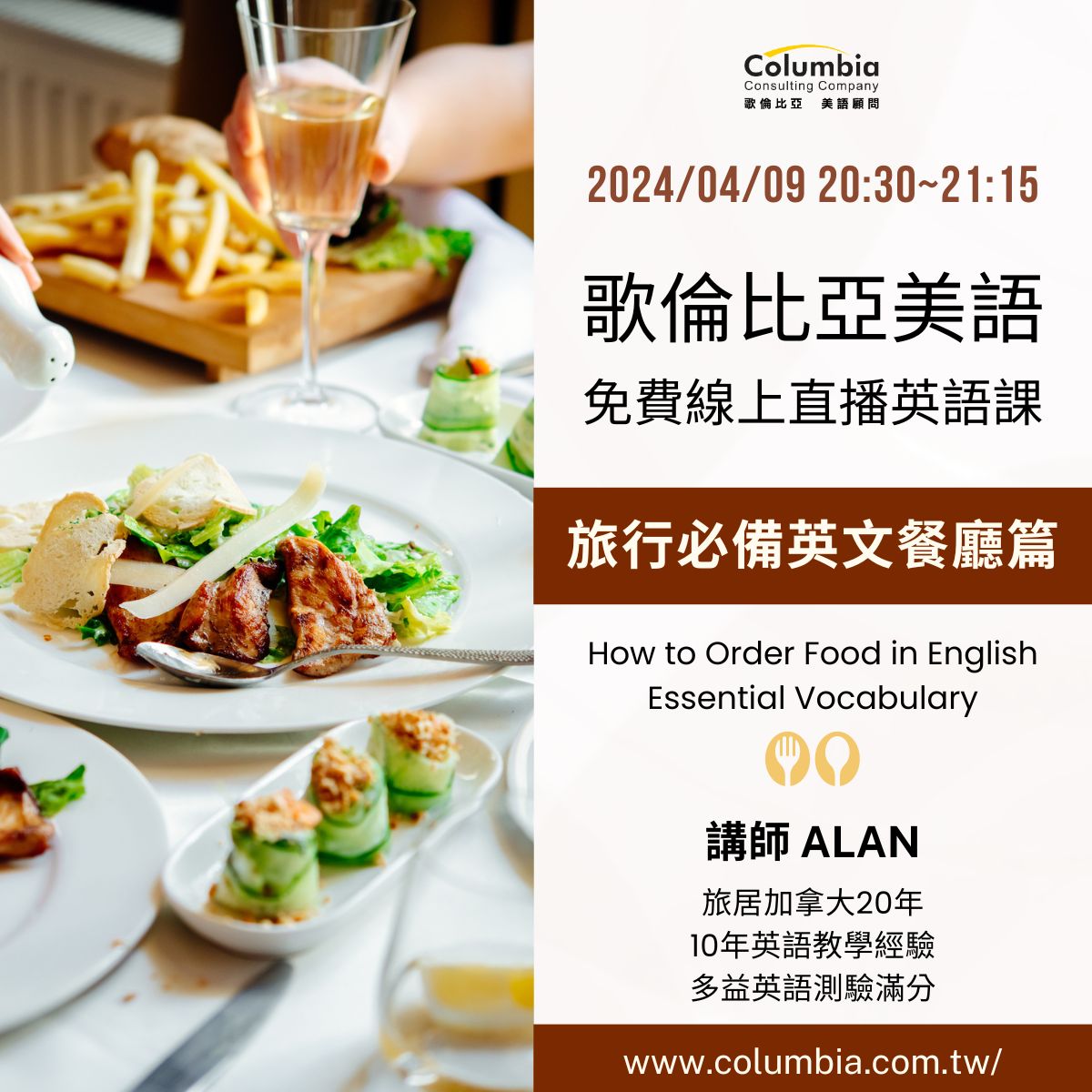 國外點餐不再比手畫腳!上完這堂課當你在國外旅行時,能更自信地使用英文點餐。專業講師Alan除了頂尖教學能力,還擁有在國外旅居多年的經驗,將與歌倫比亞美語一起在線上直播,教你實用的點餐英文,包含基本用餐禮儀、點餐時的實用詞彙、其他飲食需求的表達,以及應對可能遇到的常見情境。讓你在國外用餐時感到更加輕鬆自在,不僅能夠滿足食慾,還能透過良好的溝通經驗,讓整段旅行更精采。
