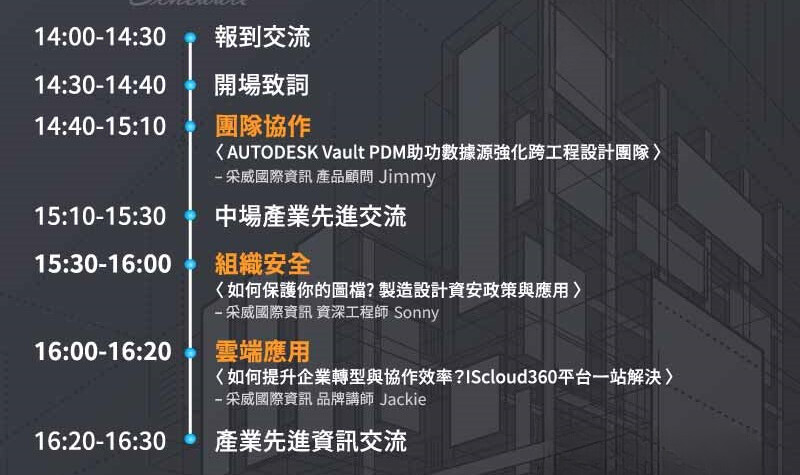◆ 特別邀請講師:采威國際資訊 徐至鋒 產品顧問、采威國際資訊 林曜勛 資深工程師、采威國際資訊 蕭博元 品牌講師。