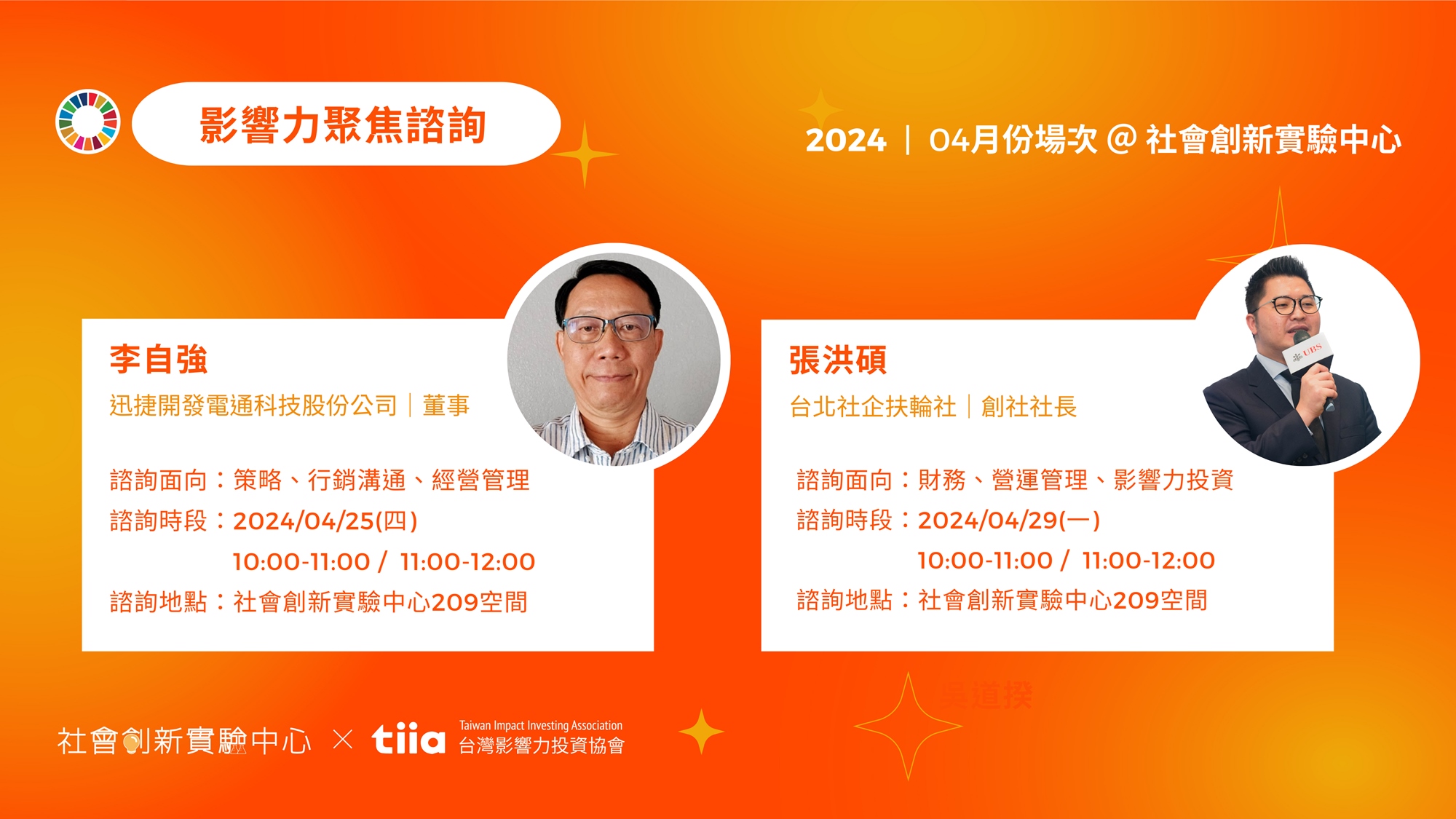 是由社會創新實驗中心(社創中心)與台灣影響力投資協會(tiia)合作的公益諮詢活動,將安排影響力投資、及各界專業領域大師在社創中心與您進行一對一的實體諮詢幫助創業者解惑。