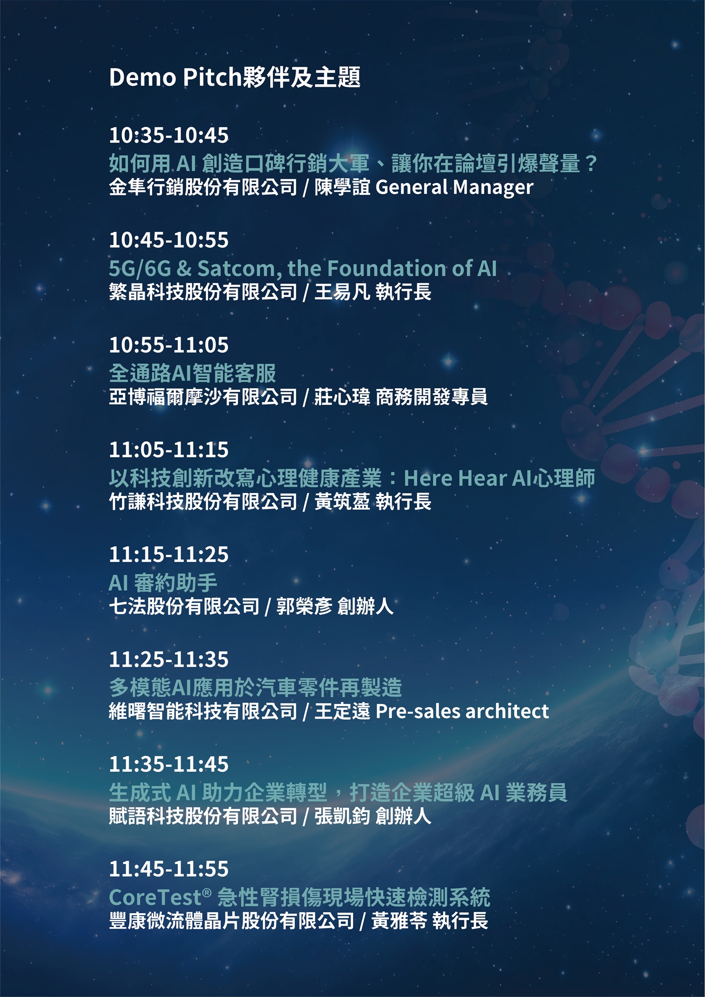 由8家新創夥伴進行Demo Pitch,每家10分鐘,帶來產業最新應用介紹。