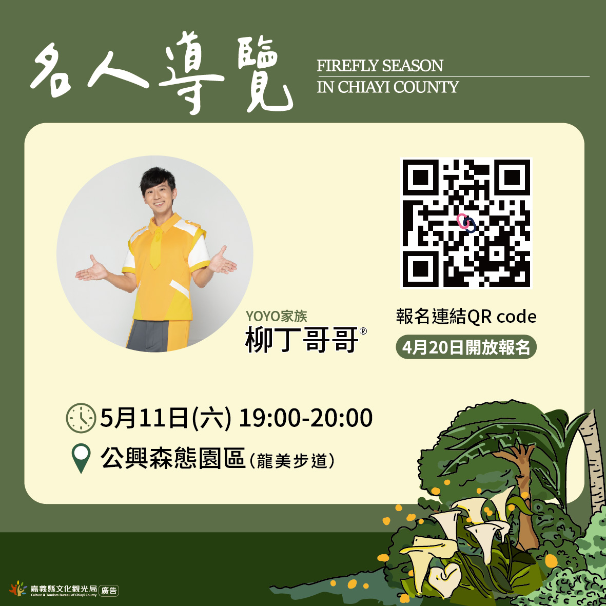 活動說明:邀請 YOYO家族 柳丁哥哥 與專業螢火蟲導覽員,帶領小朋友進行螢光生態小學堂。