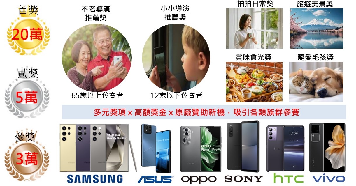 | 不老導演推薦獎1名 | 為鼓勵長者拍攝和持續學習,評審從65歲以上參賽者作品,擇優評選1名 | SAMSUNG S24 Ultra智慧手機 獎牌一座 |