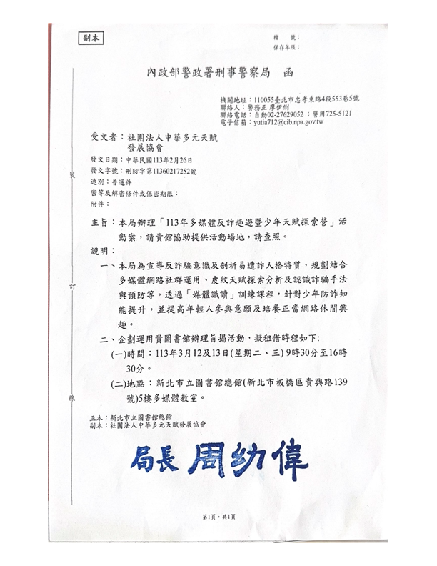 內政部警政署刑事警察局主辦「113年多媒體反詐趣遊暨少年天賦探索營」