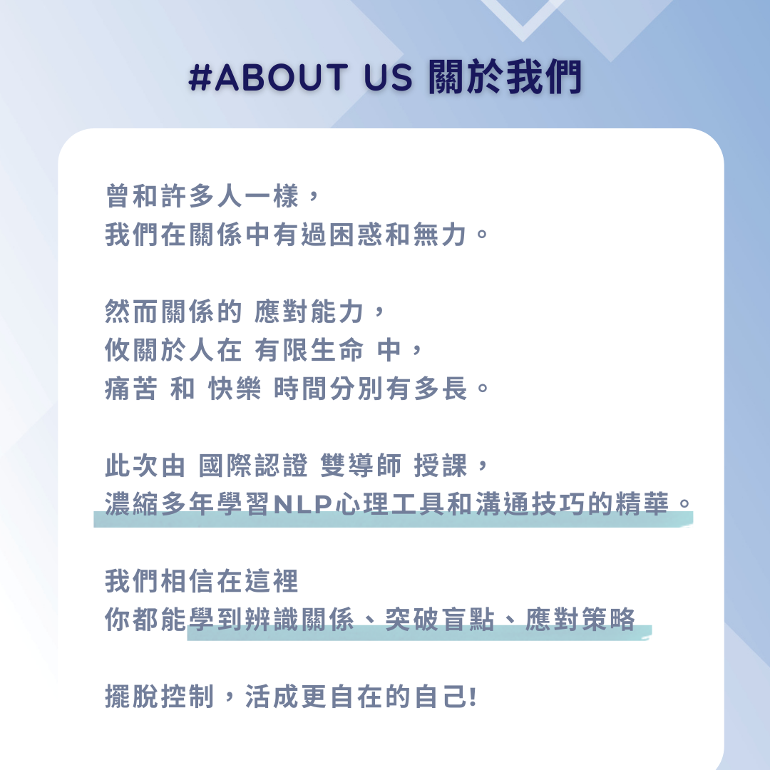 相信溝通是為了建立有意義的關係,表達是為了傳遞有價值的訊息,當我們善用NLP這個工具箱,就更能夠與他人建立關係,並且傳遞價值。