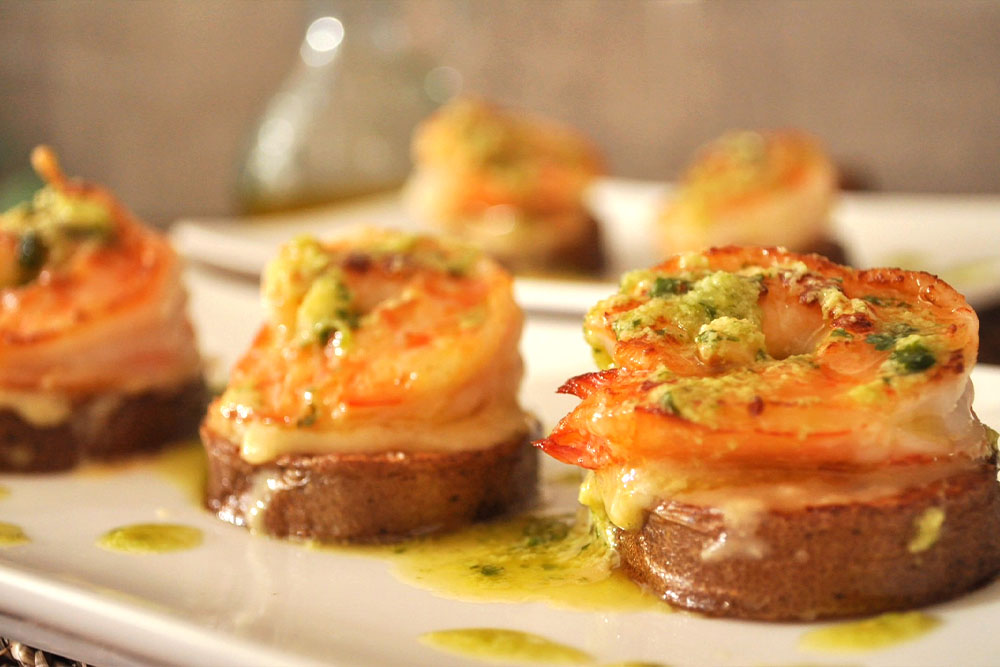 這道料理使用玉米醬、青醬,風味上有著玉米醬的鮮甜與青醬中一點堅果風味,而外觀上有黃、綠,再加上煎熟後的橘紅蝦身,顏色誘人、簡單卻具有美感。學回家、臨時要招待朋友在家開趴也完全不擔心!