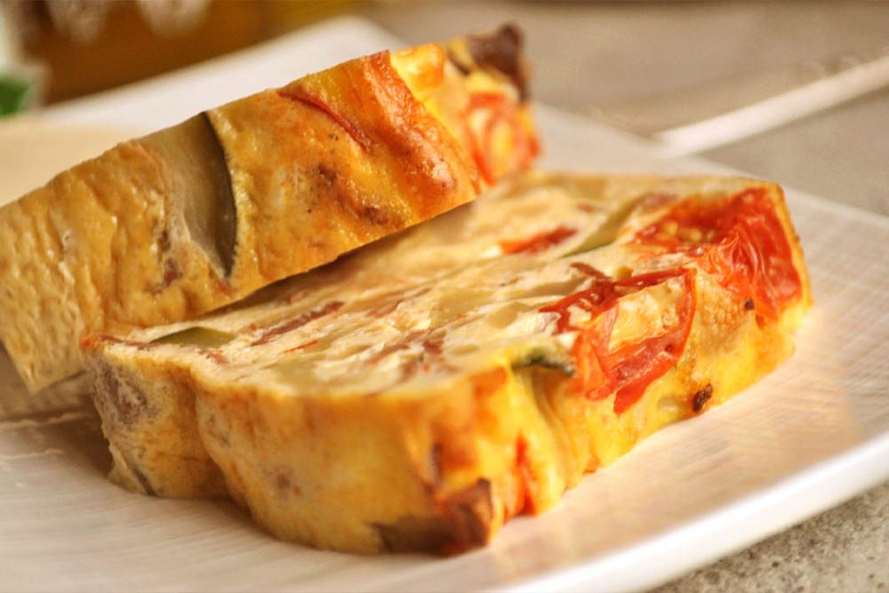 義大利烘蛋 Frittata,與歐姆蛋利用摺疊法裹住內部大部分已熟的食材不同,主要會先將食材與蛋液混合才倒入鍋內加熱,最後,再利用烤箱大火烘烤或整個翻面的方式來將烘蛋上半部煮熟。