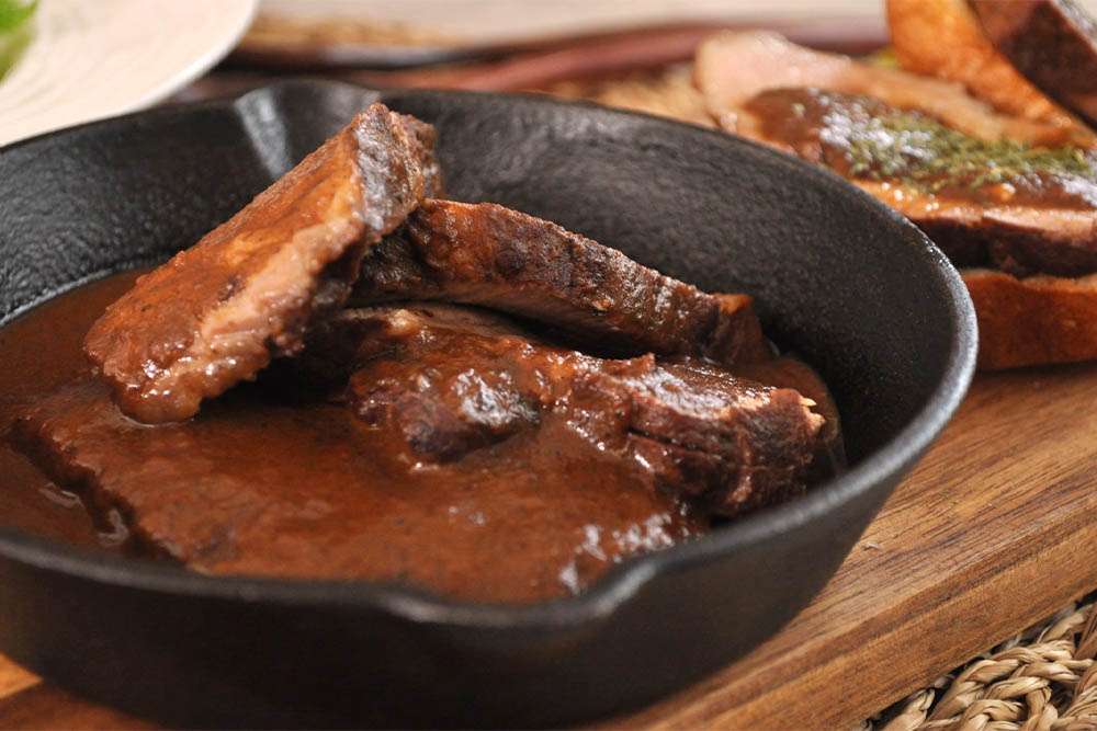 德式漢堡一般以大塊豬肉燉煮後分切成片,但此次課程使用分切好的活力豬梅花豬排,讓您在家料理時省去一道工,同時加速燉煮時間,讓料理更加愜意~濃郁醬汁搭配芥末醬、酸黃瓜一起品嘗,很可以提升夏日食慾~