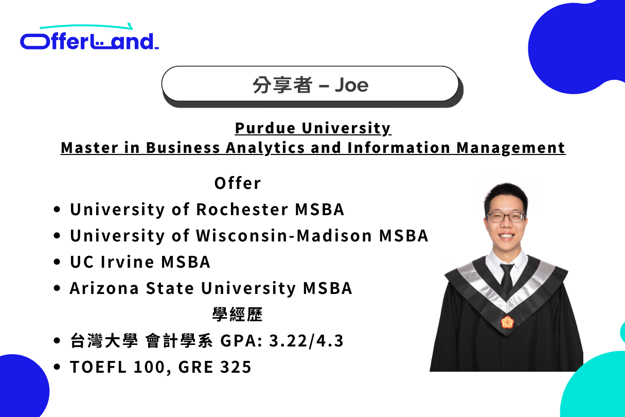 OfferLand 邀請即將前往 University of Minnesota (UMN) 就讀 MSBA 商業分析碩士的 Ruth,來跟我們分享在沒有代辦的情況下,如何通過潤稿、饅頭計畫完成申請。分享如何找資源、寫申請文件重點、面試準備等一手資訊;並邀請今年從臺大會計畢業,準備前往 Purdue University 就讀 MSBA 的 Joe,分享選校、申請文件撰寫以及面試經驗!