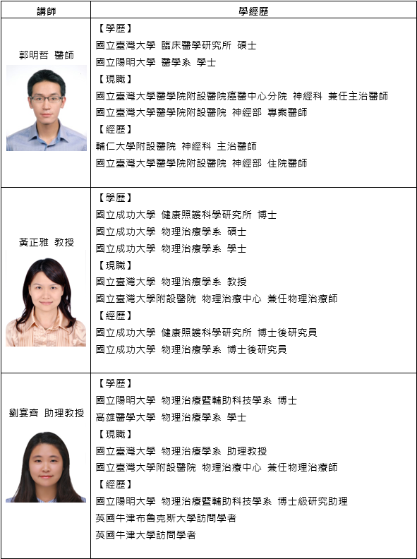 下午的課程邀請專精於巴金森氏症手術的雙和醫院神經科 洪千岱教授來為大家介紹巴金森病深腦刺激術最新發展、專精於動作學習與控制的臺大物理治療學系 李亞芸副教授將為大家介紹改善巴金森氏症患者動作學習障礙之方法。此外,亦邀請台灣職能治療學會 林麗珍職能治療師為大家介紹巴金森氏症患者職業重建和職務再設計、臺大醫院復健部 張綺芬語言治療師來為大家分享巴金森氏症患者的語言與吞嚥問題及介入。各專業講師皆在臨床及學術領域執業多年,擁有相當豐富的實務經驗,必能為大家帶來豐富且實用的觀點。