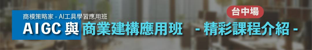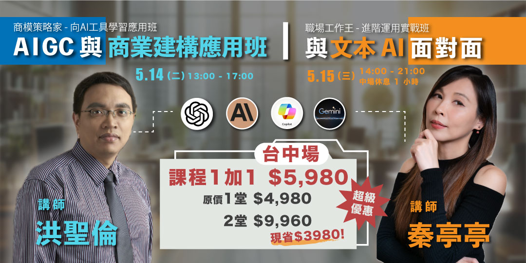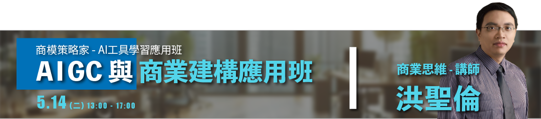 - 5/14(二)13:00 -17:00➡️AIGC與商業模式建構應用班
