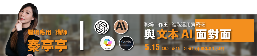 全程 4 小時(休息時間與導師交流時間 0.5 小時) - 5/15(三)14:00 - 18:00、19:00 - 21:00➡️與文本AI面對面應用實戰班
