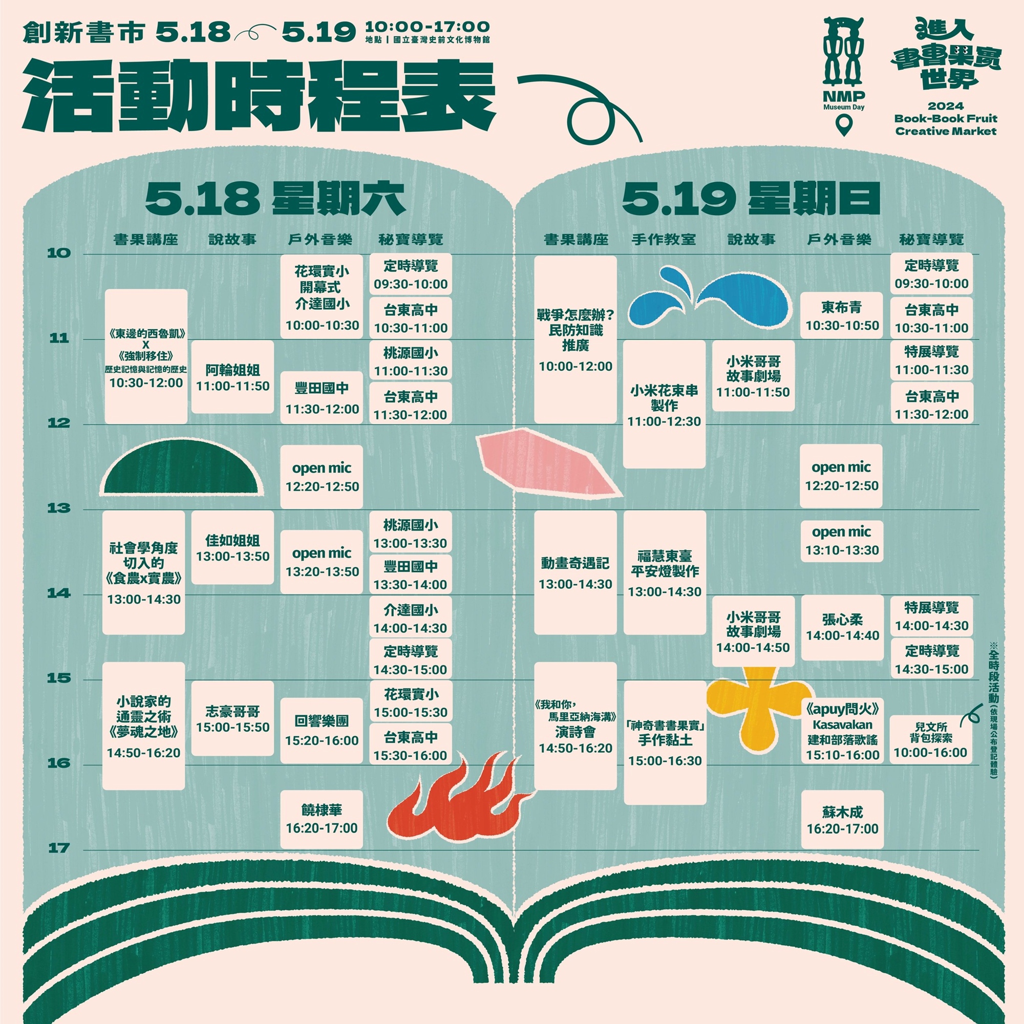 將市集兩日內的「書果講座」、「手作教室」、「說故事角落」、「戶外音樂舞台」、「秘寶導覽」的時間清楚呈現給大家!