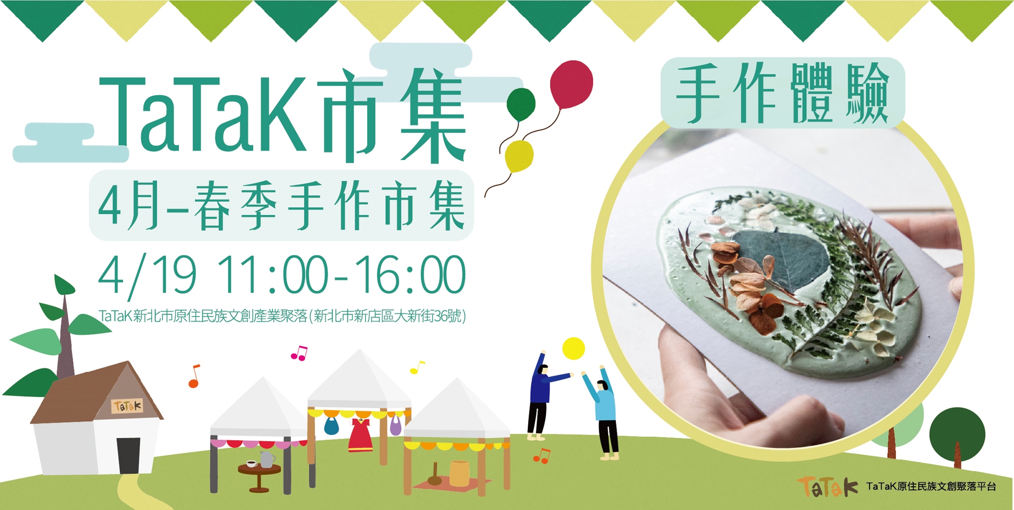 本次新北市原住民族文創產業聚落平臺規劃辦理《春季手作》TaTaK市集,以原住民族工藝文化為主題佈置,並從春意盎然的大自然中,尋找創作靈感,學習原住民族群「取材於自然,用之於生活」的工藝文化!