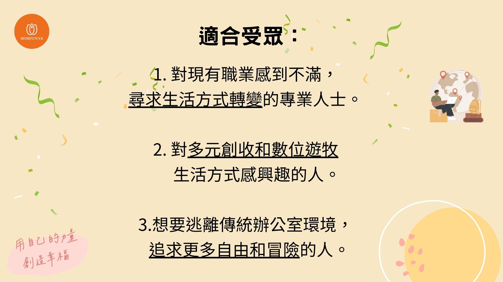用自身經驗來分享多元創收及如開啟數位遊牧的新篇章。