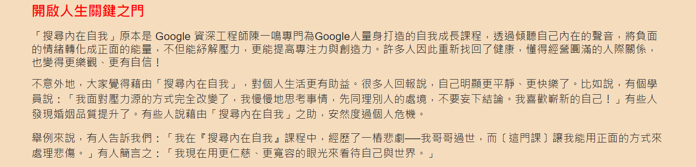 僅僅16小時的課程,為什麼就能讓 Google 最優秀、最聰明的員工在工作上、生活上從此脫胎換骨,創造出全新的人生意義和價值?這到底是怎麼辦到的?
