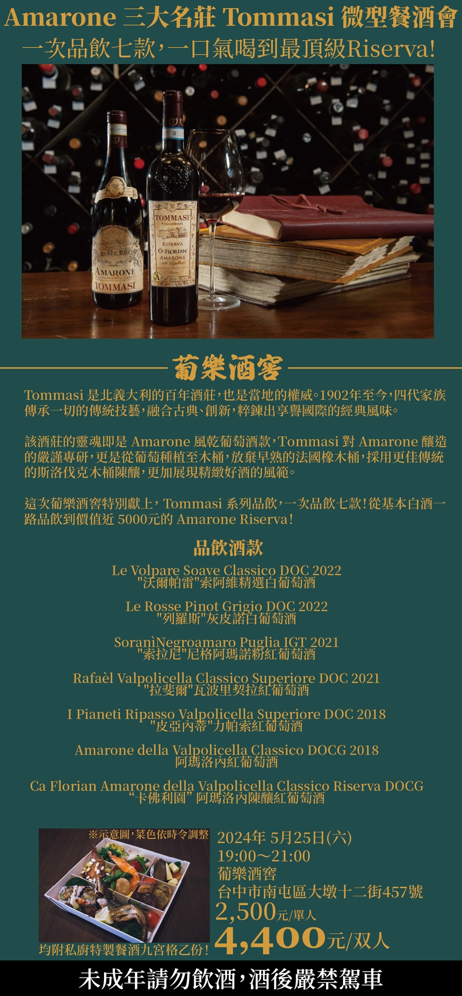 1902年就開始深耕至今,北義無人能出其右的百年家族「Tommasi」,這次來葡樂舉辦餐酒會啦!這次誠意滿滿,一次品飲七款酒款,並且喝到這家最經典兩款 Amarone ,連同頂規 Riserva 一起開給你喝!!