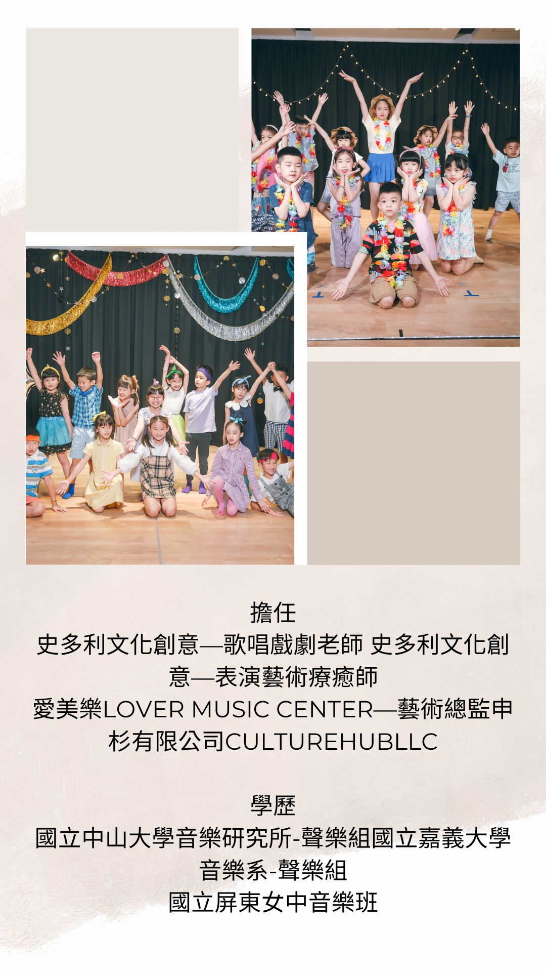 - 本課程會有課堂紀錄、演出呈現紀錄,於課程後提供給家長留念。