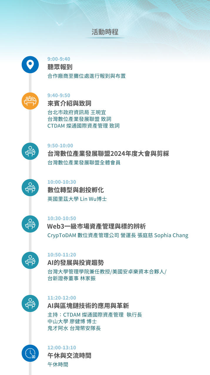 本次活動由台北市政府產業發展局、台北市政府資訊局指導,《台灣數位產業發展聯盟》、《CrypToDAM數位資產管理公司》主辦,邀請邀請大學教授、業界專家、領域KOL,以專場與圓桌論壇進行交流,旨在為與會者提供一個深入探討區塊鏈、人工智慧及金融科技最新趨勢的平台。透過深度活動交流,激發新興科技的應用、跨界合作,為創投管理提供動能,促進科技金融產業投資、孵化、升級。