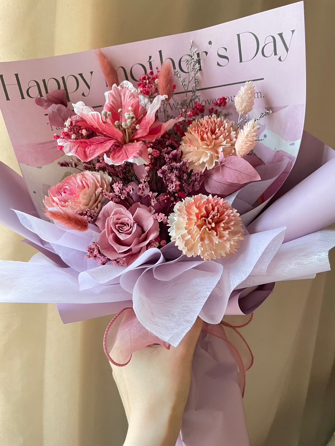 由【花樣人生花藝坊】的欣怡花藝師,以時下流行之永生花、乾燥花材搭配製作送予媽媽們的美麗花束。