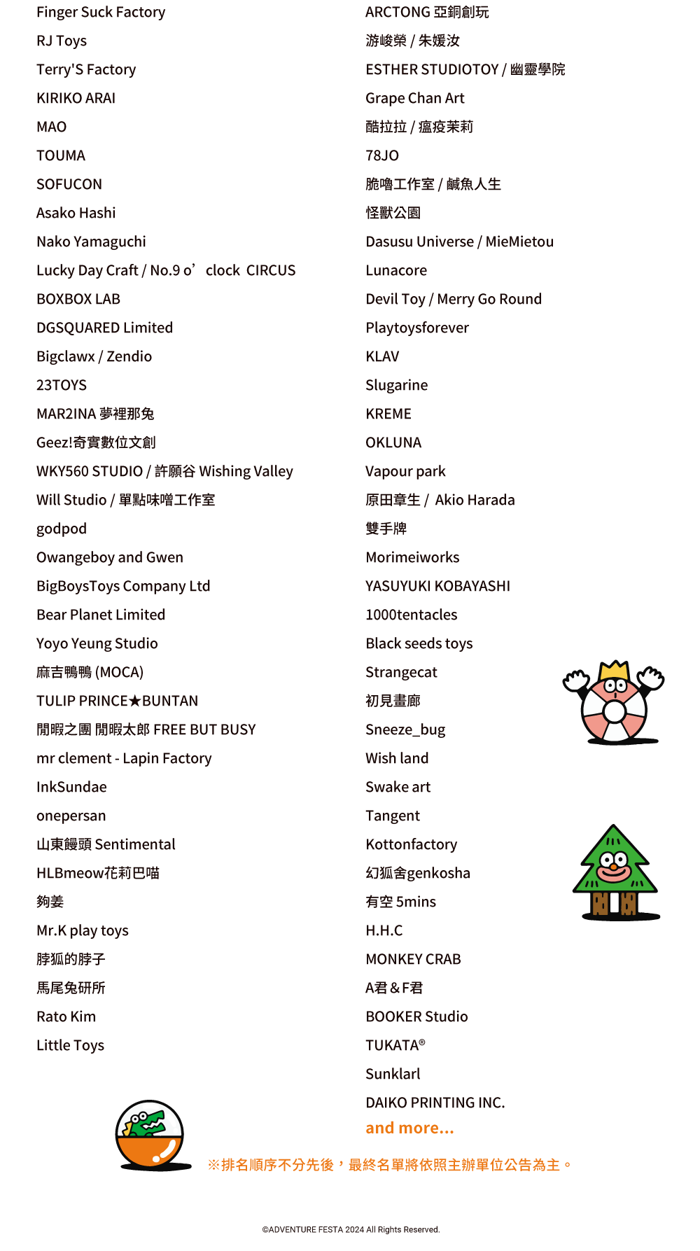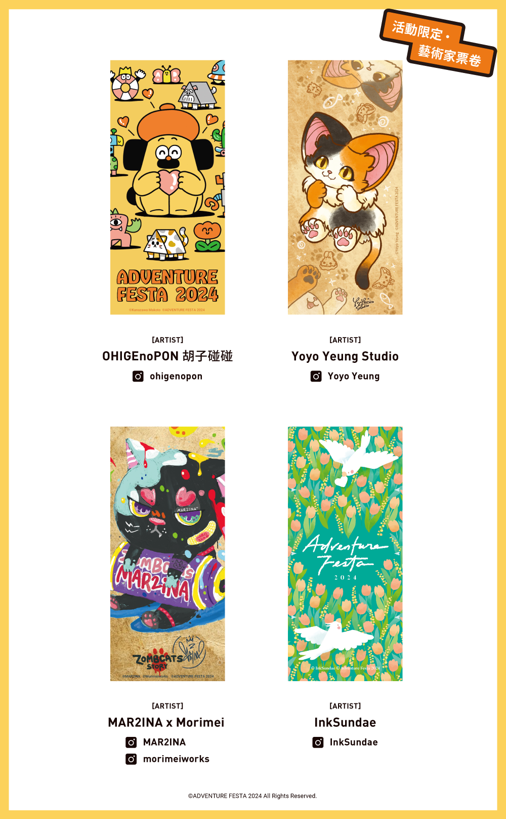 很榮幸邀請到 4 位不同領域的大人氣創作者,為 ADVENTURE FESTA 2024 設計展會專屬實體入場券。所有前來參與活動的冒險者朋友們,都有機會自己選擇喜歡的款式作為收藏。