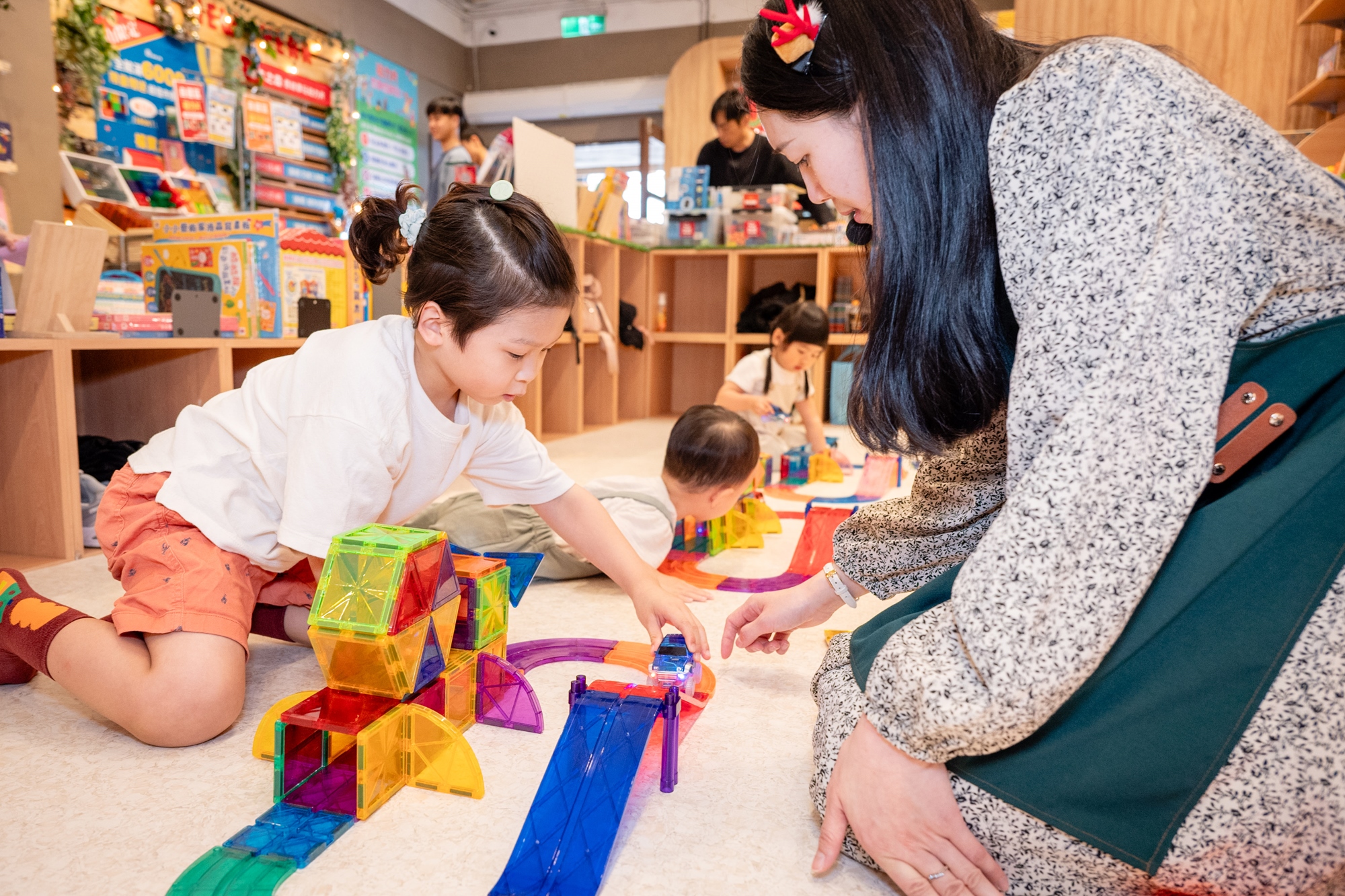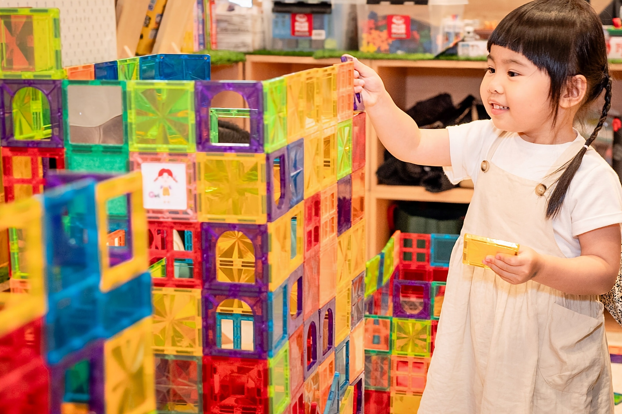 柔軟的白色小教室裡,有成千上萬的磁力片等著小朋友前來探索。直角三角形、正三角形、五角形、1/4圓形、大地板、磁力車車,從基礎型到特殊造型,通通都可以盡情運用!還有滿滿小玩偶可以邀請到專屬城堡裡作客唷!
