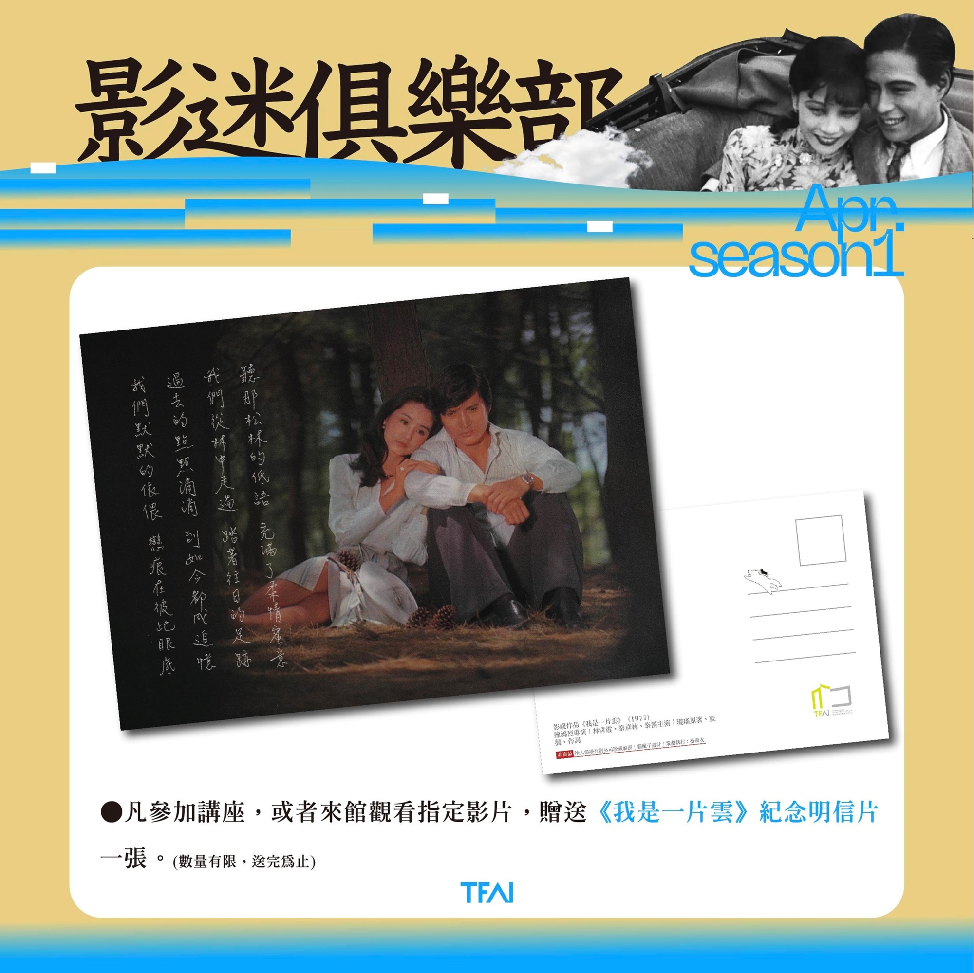 凡參加講座,或者來館觀看指定影片,贈送「我是一片雲」紀念明信片一張(數量有限,送完為止)。