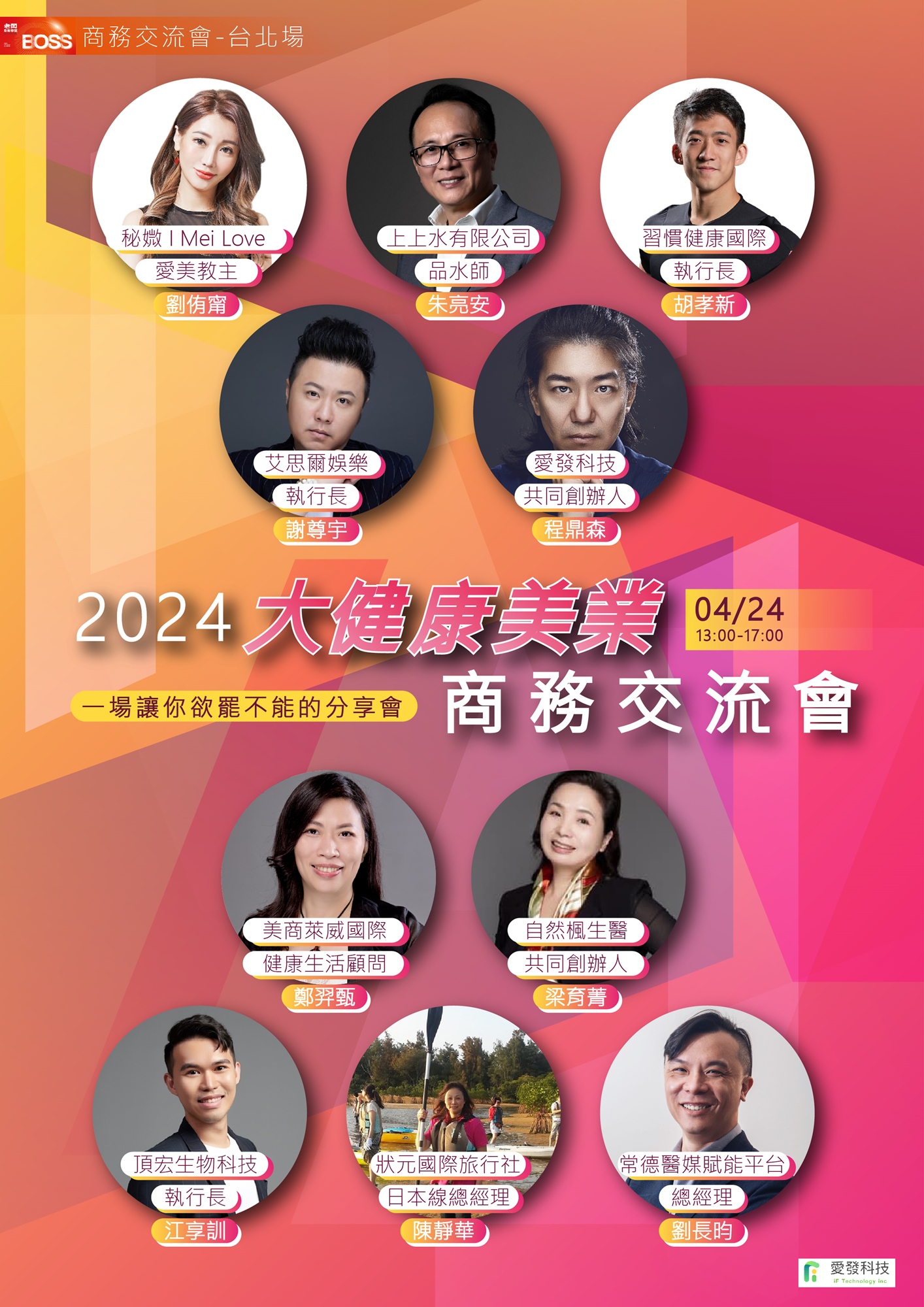 活動說明:這場大健康美業商務交流會匯聚了10位來自各個專業領域的專家,共同探討大健康美業領域中的品牌策略布局。我們將深入研究如何在傳統媒體、數字媒體、零售渠道和社交媒體等多個行銷渠道上實現品牌的全面佈局,同時分享行業內的最新趨勢和最佳實踐。