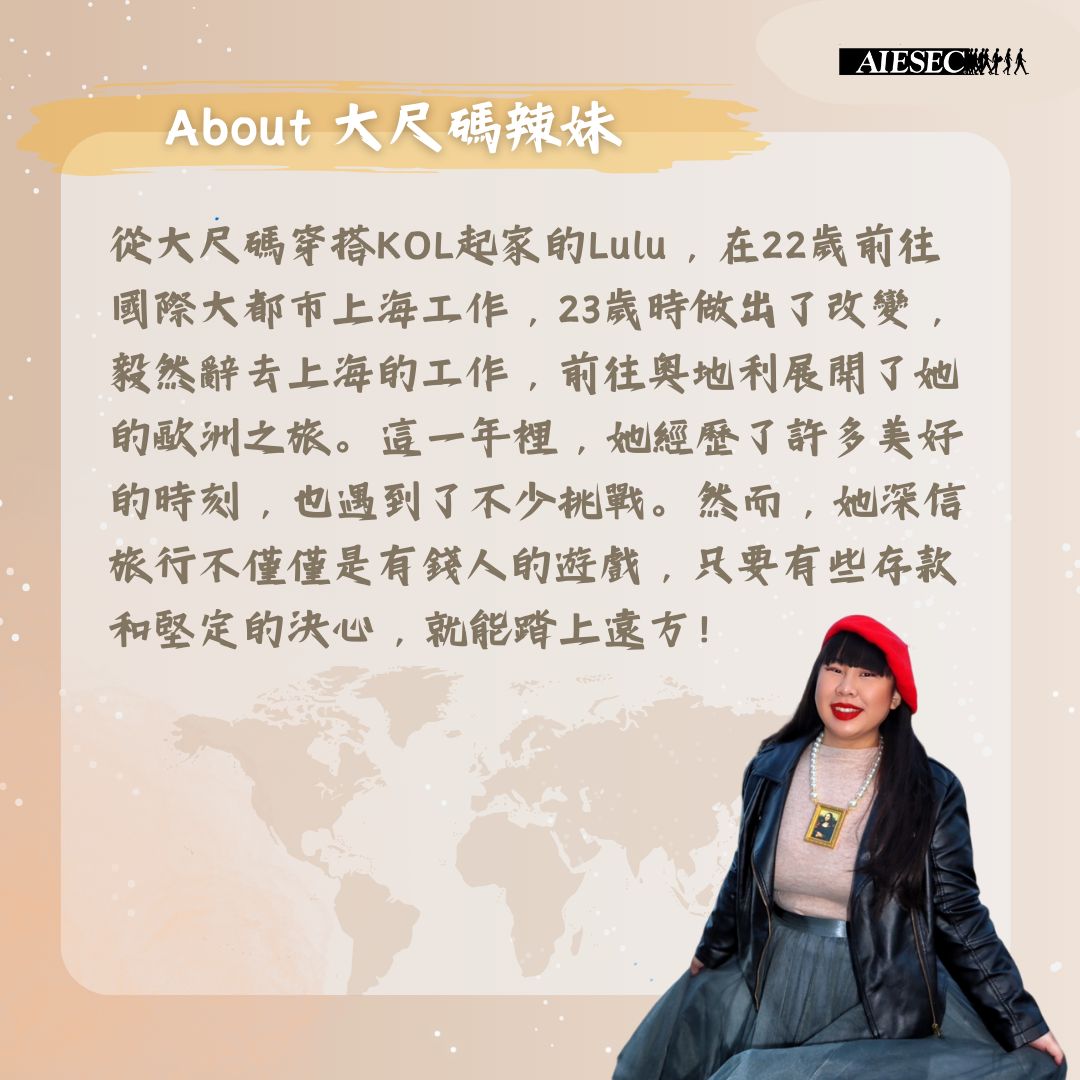 從大尺碼穿搭KOL起家的Lulu,在23歲時做出了改變,毅然辭去上海的教學工作,前往奧地利展開了她的歐洲之旅。然而,她深信旅行不僅僅是有錢人的遊戲,只要有些存款和堅定的決心,就能踏上遠方。