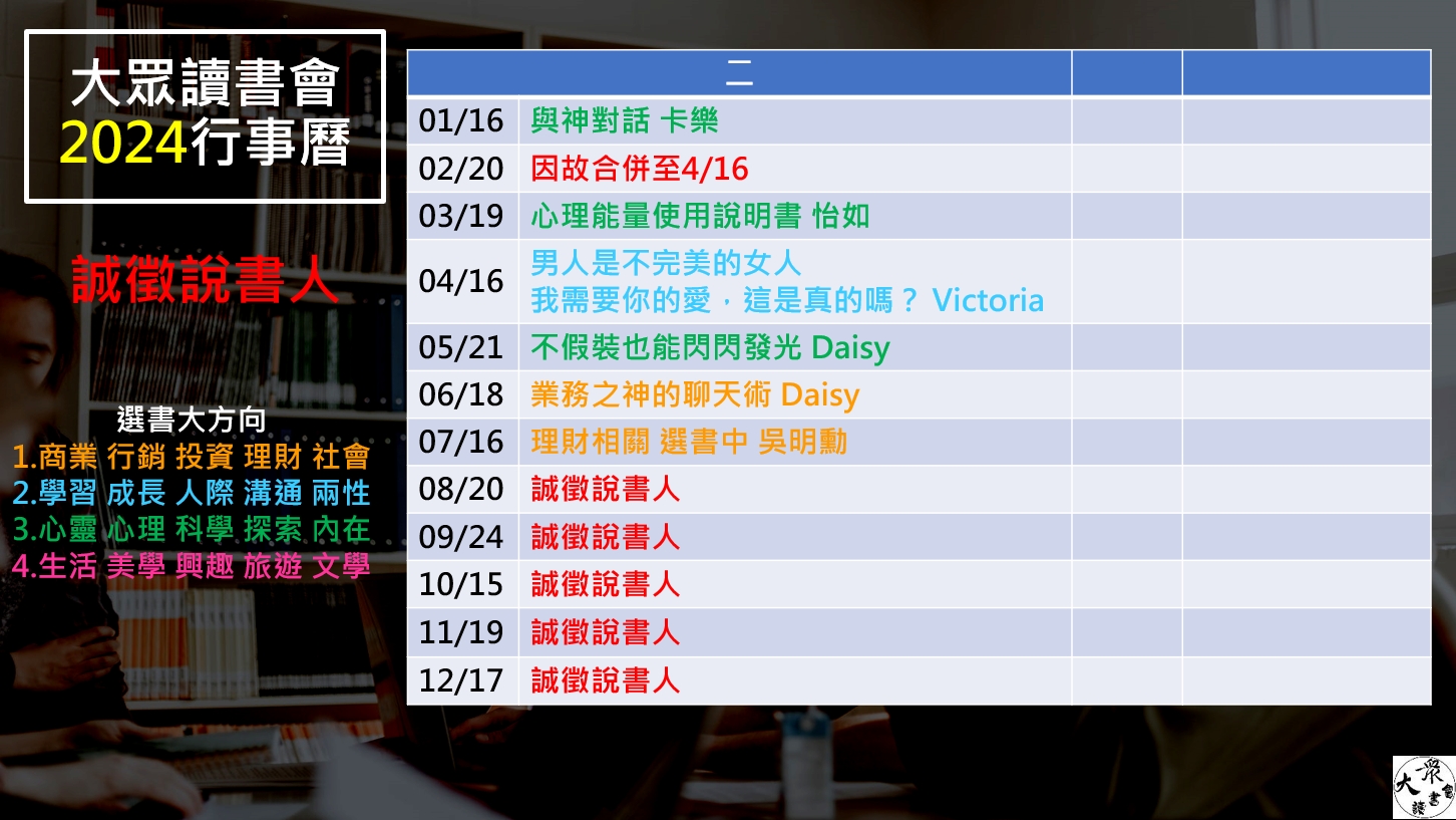 線上讀書會(免費)每月晚上1930~2100(實際時間看講者)