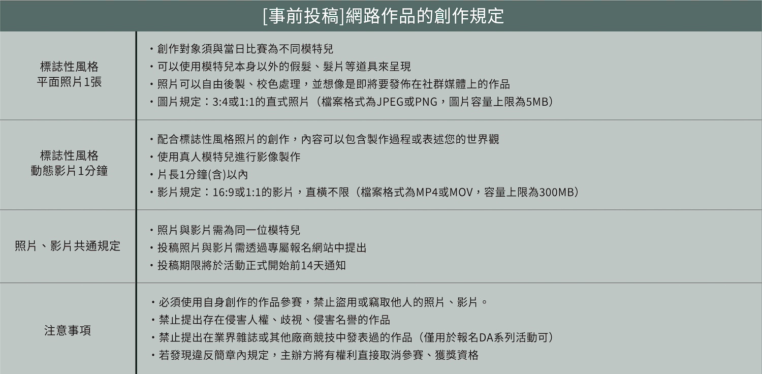 參賽者:$3,800/組(每組最多3位,含1位設計師 + 1位協助者 + 1位模特兒)