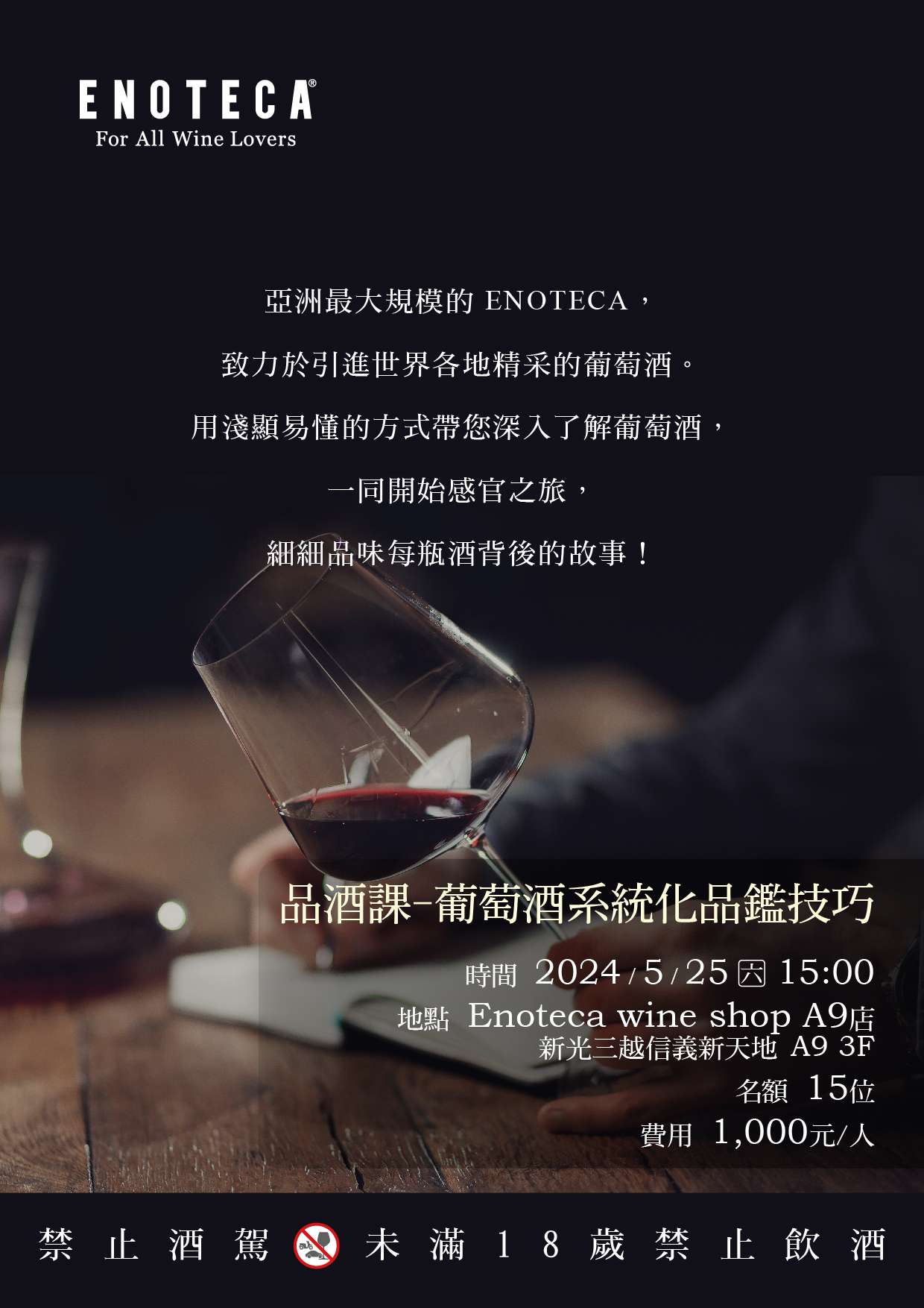 ENOTECA結合新舊世界經典產區酒款,藉由系統化方式『 拆解步驟 』 、 『 品飲架構 』和『 表達技巧 』,將品飲感受轉化為豐富的味覺體驗,培養品酒技巧。