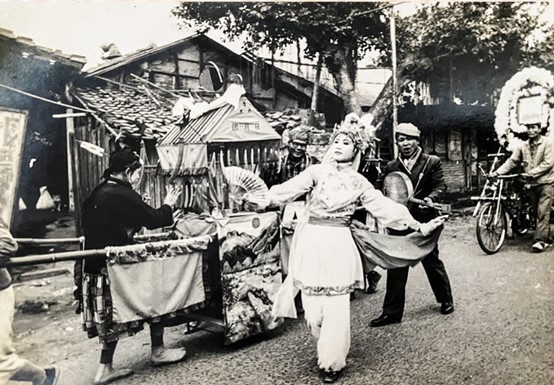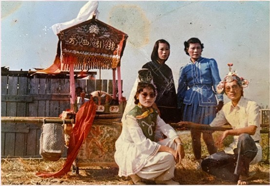 (照片說明:右一為法師,在青少年時期飾演小旦角色,父親在下營地區最早經營牽亡歌,照片中香亭於下營水災中損壞。)