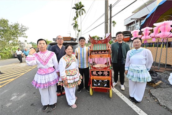 (照片說明:前方三位女性穿著是改良後服飾,由第一張黑白照小旦服裝演變成三件式,前排中間周麗華女士國小畢業從事牽亡歌至今六十年,見證牽亡歌興衰。)