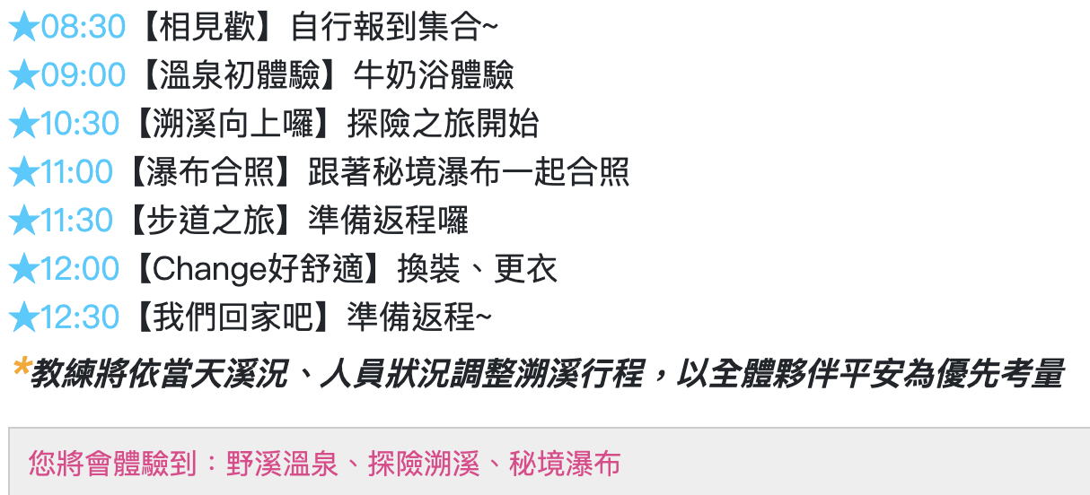 4.溯溪是團隊活動,教練將依當天溪況、人員狀況調整溯溪行程,以全體夥伴平安為優先考量。