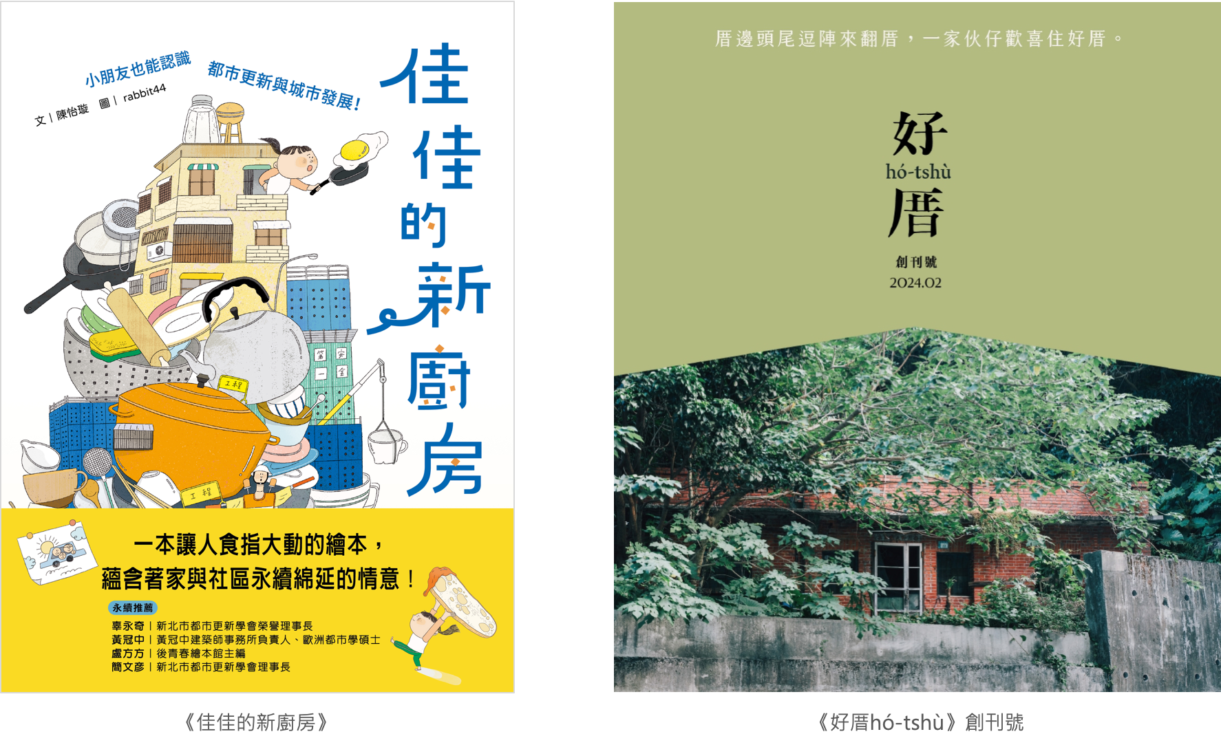 新北市都更處攜手小木馬編輯團隊,出版台灣第一本都更繪本《佳佳的新廚房》,以喜愛料理的家庭生活為故事背景,從孩子的視角看房屋的變化及都更的歷程。此外,新北市都更處也以刊物《好厝hó-tshù》,採集居民真實故事、專家經驗,用更有溫度的方式,帶出都更的重要概念。