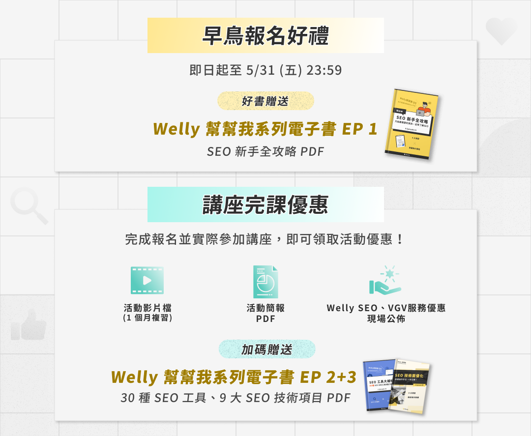 - Welly 幫幫我系列電子書 EP 2+3 (30 種 SEO 工具、9 大 SEO 技術項目 PDF)