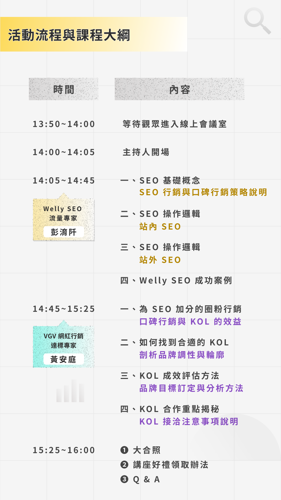 本場講座將帶你從基礎認識 SEO,了解站內外 SEO 運作原理與實作建議,並搭配 KOL 行銷,包括目標設定、網紅媒合技巧以及與 KOL 合作的關鍵注意事項等,跟著 Welly 與 VGV 讓你的網站獲得 1+1 > 2 的曝光效果!