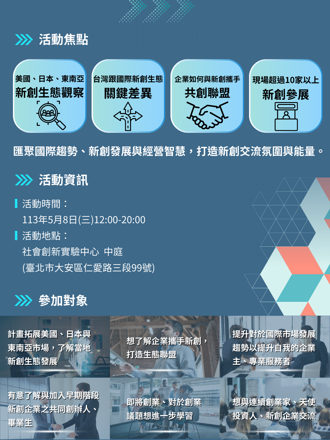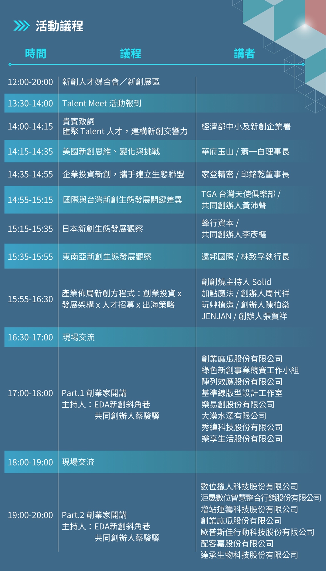 本次「 Talent Meet 國際新創生態與新創人才媒合會」為創業星光幫首場活動,本計畫執行團隊與 EDA 新創斜角巷等不同新創社群共同合作,邀請在不同產業與新創領域具備豐富經驗者出席與擔任分享者,活動內容將分享美國、日本與東南亞新創生態發展,以及安排多家新創企業進行人才招募媒合會等。匯聚國際趨勢、新創發展與經營智慧,打造新創交流氛圍與能量。
