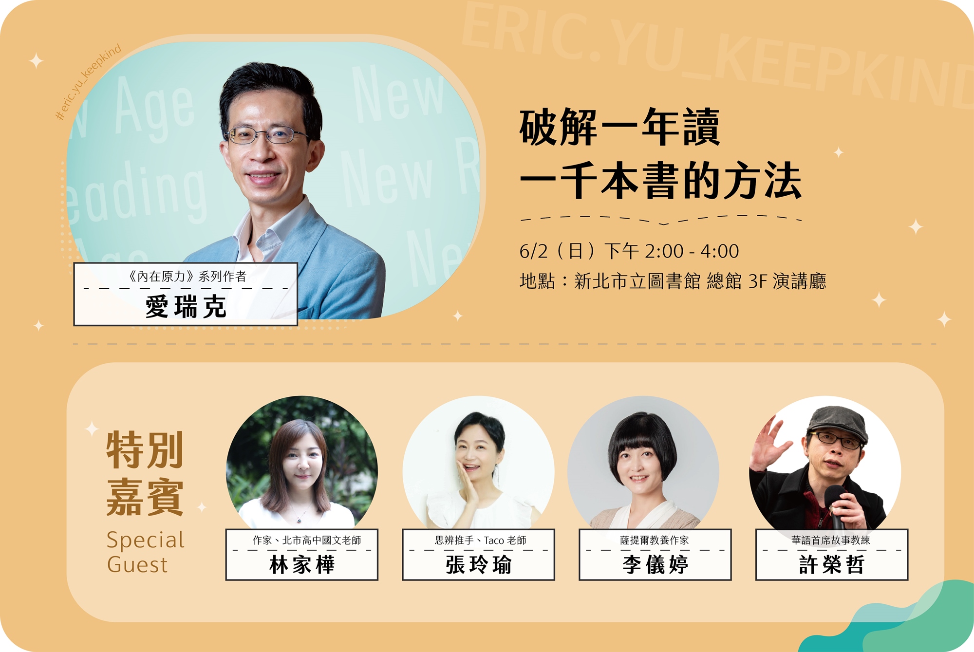 第三場則是近期出版新作的《內在成就》作者愛瑞克,身為愛書人的愛瑞克將在這場講座告訴我們,他是如何在科技時代仍舊維持閱讀的高度熱情,以及他是如何選書、如何提高閱讀理解與吸收,最後提供讀者三種實用的速讀方法。