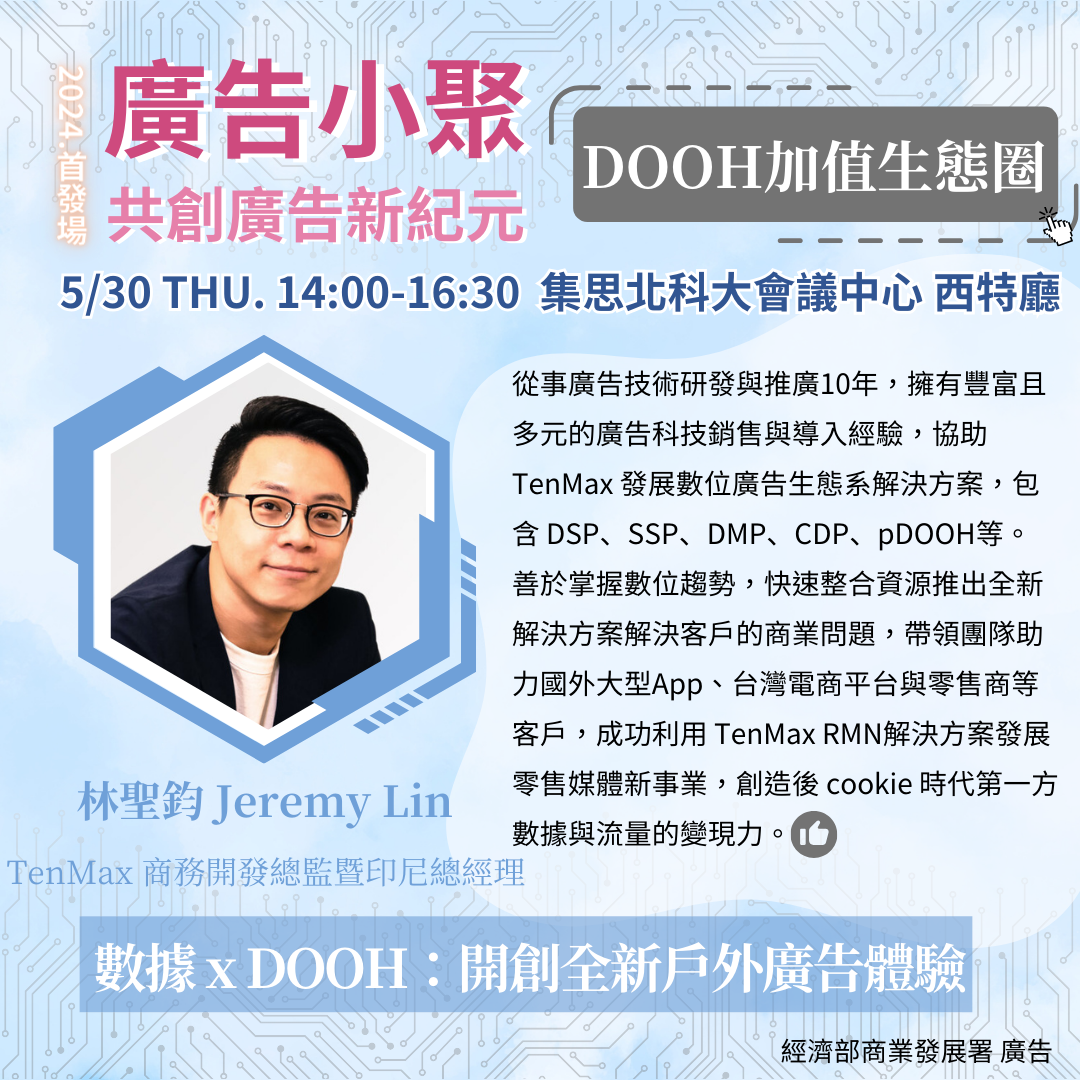 14:15-14:45 | 數據 x DOOH: 開創全新戶外廣告體驗 | TenMax 商務開發總監暨印尼總經理 林聖鈞 |