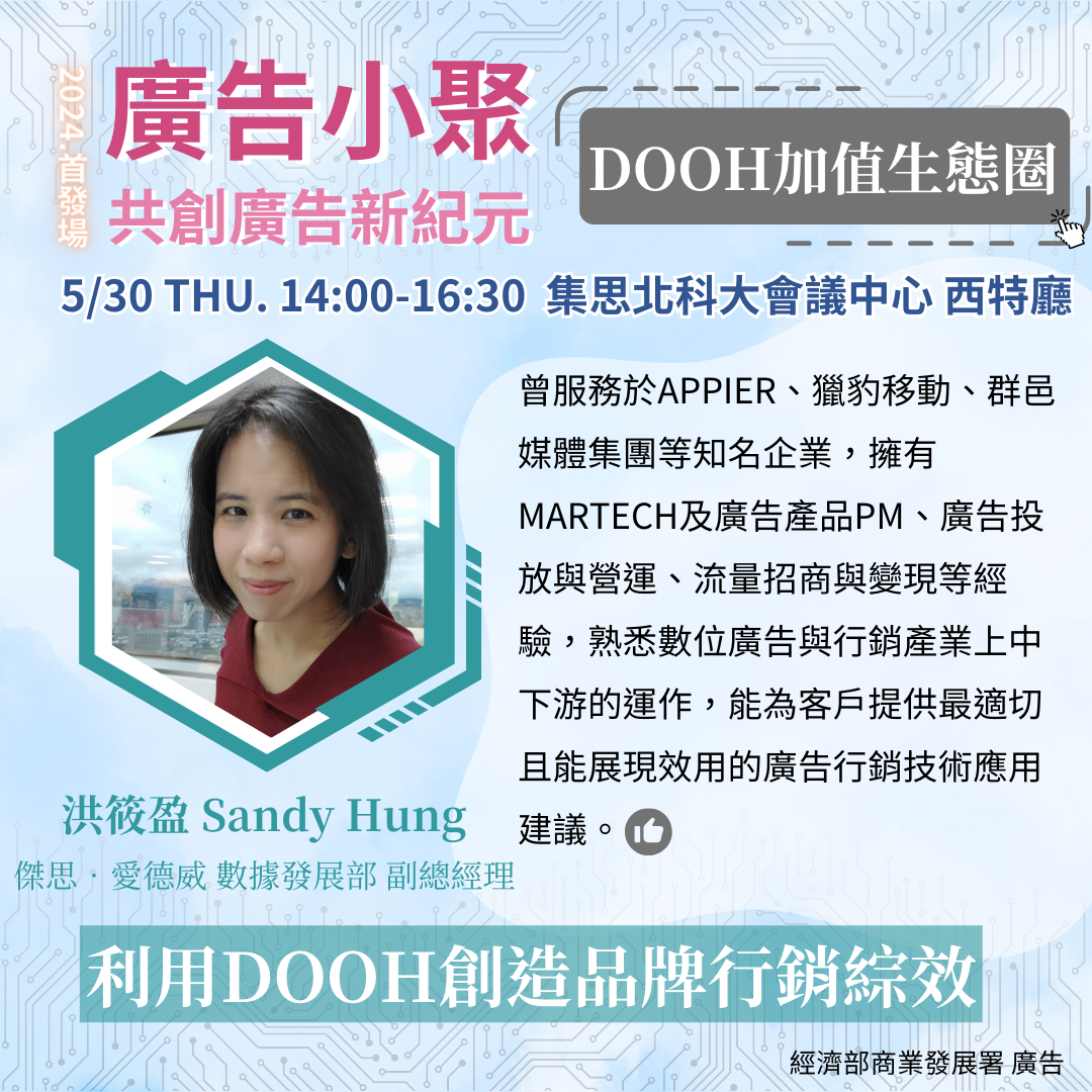 14:45-15:15 | 利用DOOH創造 品牌行銷綜效 | 傑思‧愛德威 數據發展部 副總經理 洪筱盈 |