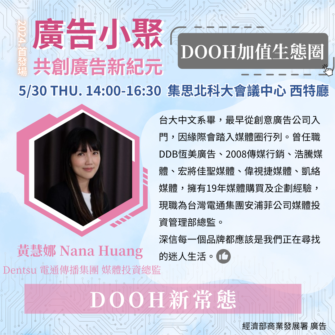 15:30-16:00 | DOOH新常態 | Dentsu 電通傳播集團 媒體投資總監 黃慧娜 |