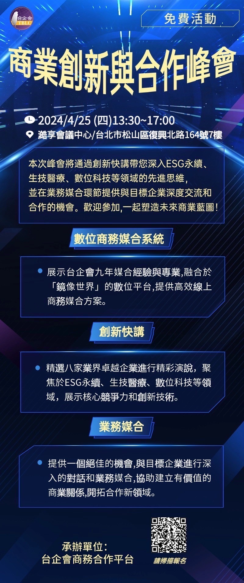 本次峰會將通過創新快講帶您深入ESG永續、生技醫療、數位科技等領域的先進思維,並在業務媒合環節提供與目標企業深度交流和合作的機會。歡迎參加,一起塑造未來商業藍圖!
