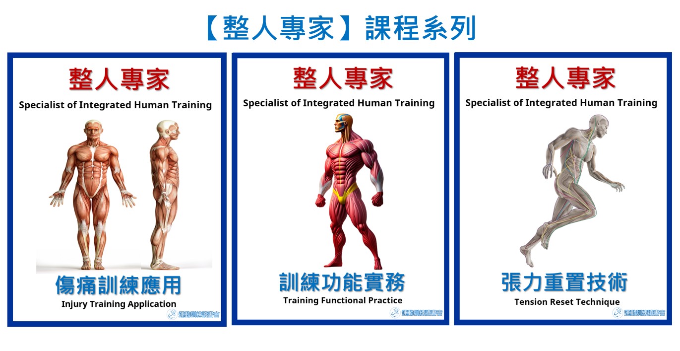 【整人專家】系列 : 「傷痛訓練應用」、「訓練功能實務」、「張力重置技術」等課程。