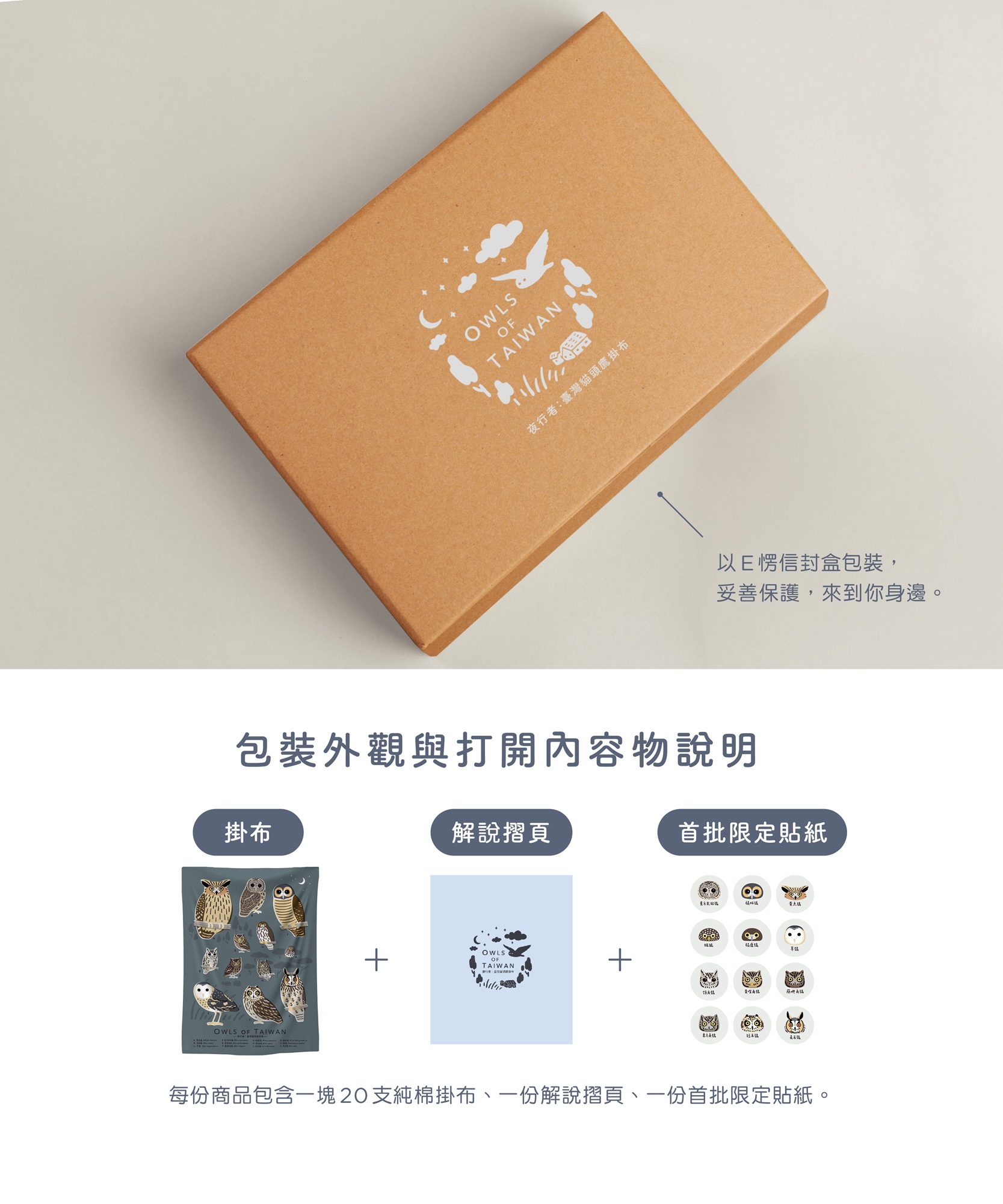 打開禮盒,除質感溫暖的臺灣貓頭鷹掛布,並附上一份全彩解說摺頁,在妝點居家環境之際,也能更深入瞭解與我們一起生活在臺灣這片土地的貓頭鷹們。