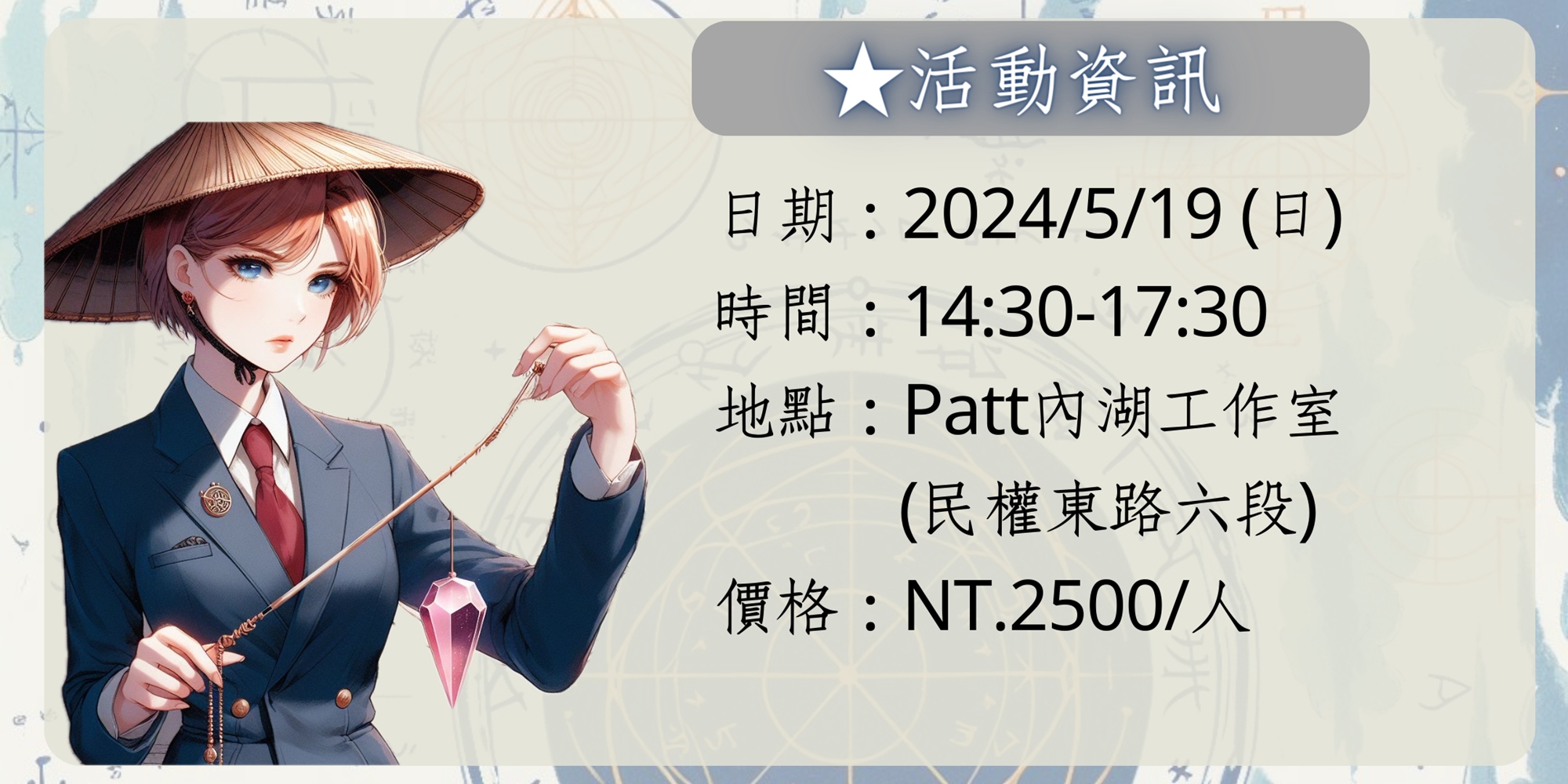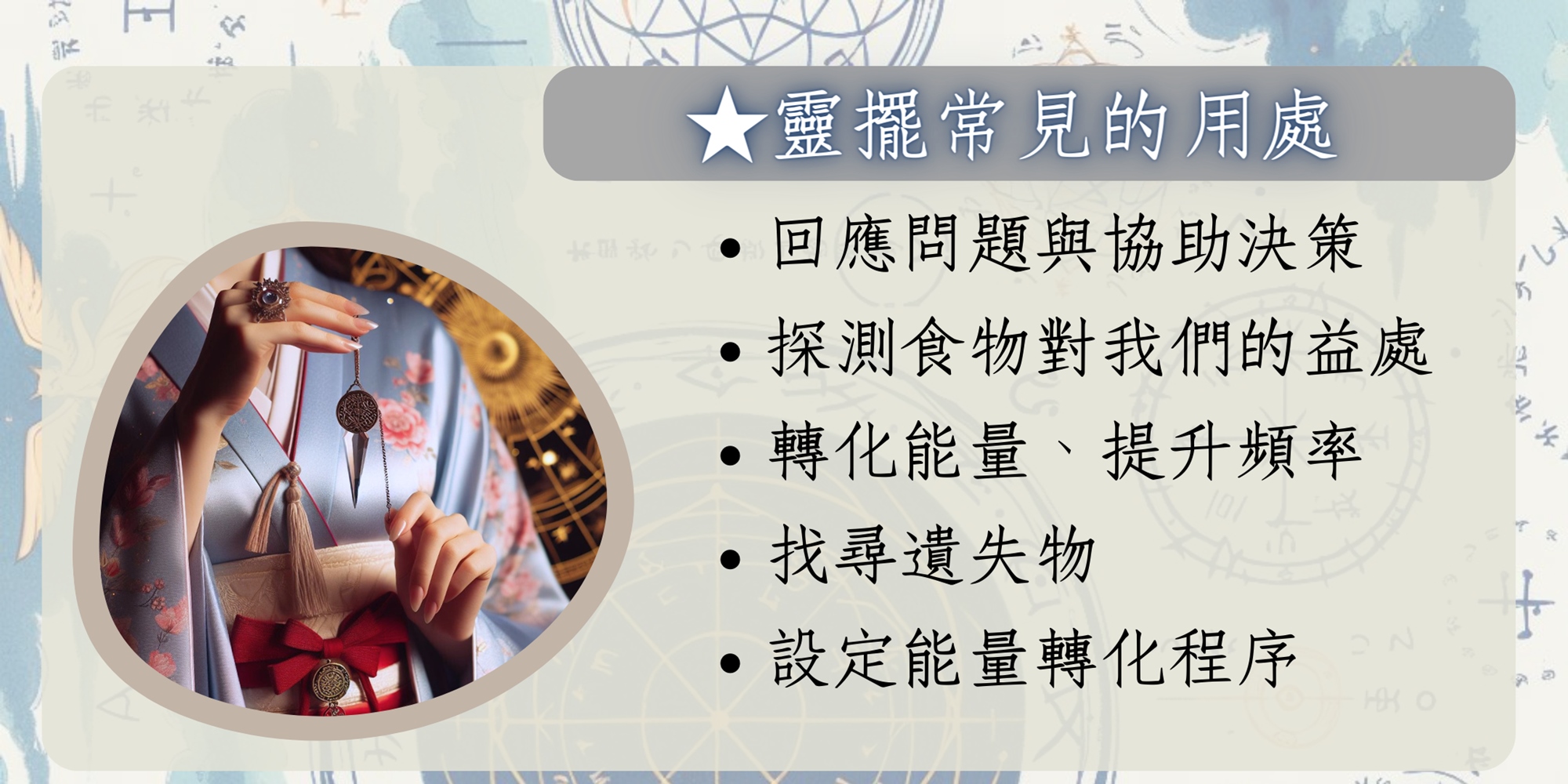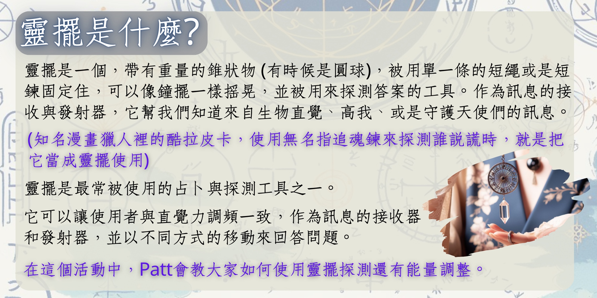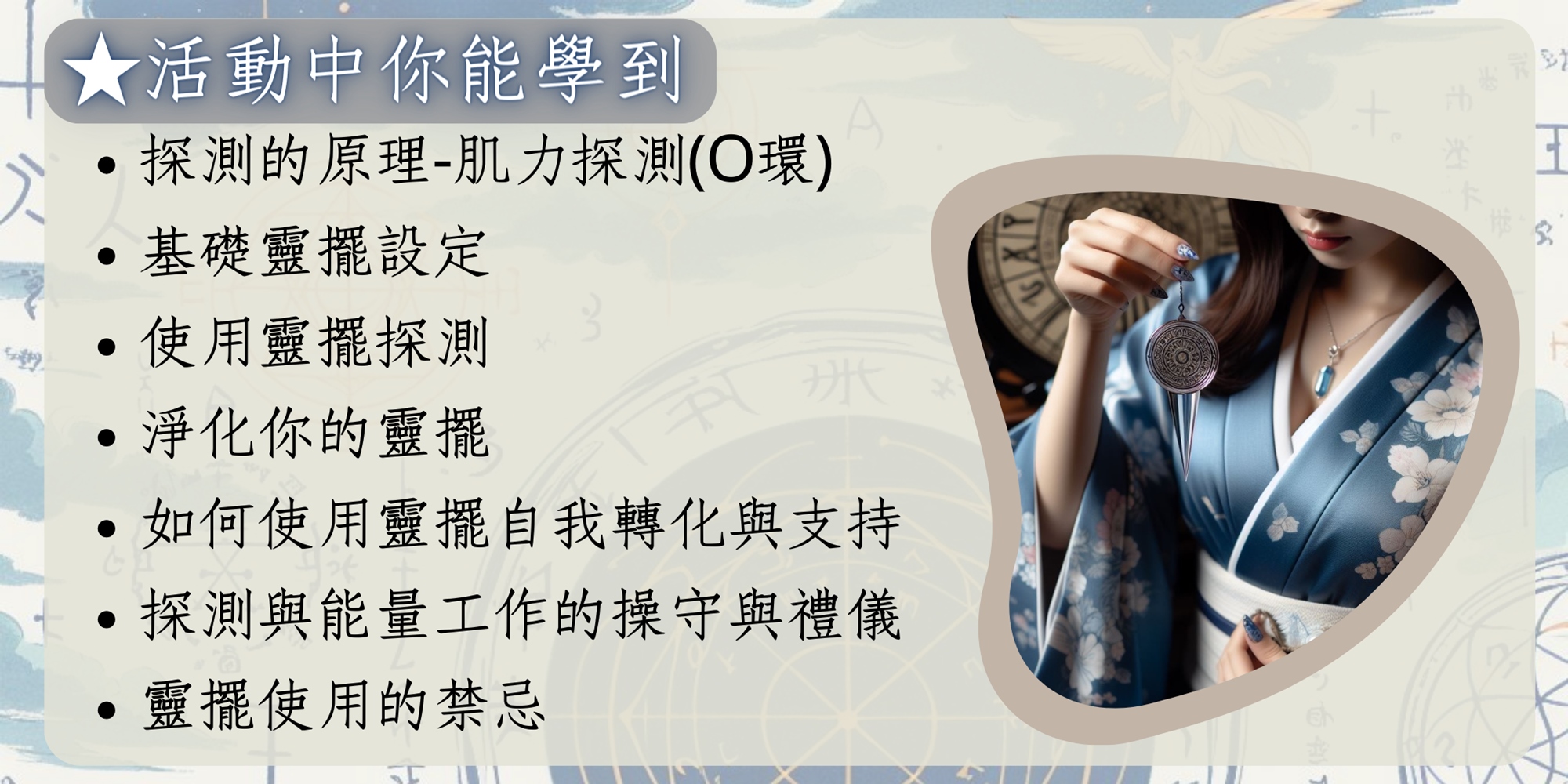加入我們的工作坊,開啟你的靈擺探測之旅,學習如何透過這種古老工具來提升你的生活品質和靈性成長。探索更多,感受更多,成為更好的你!